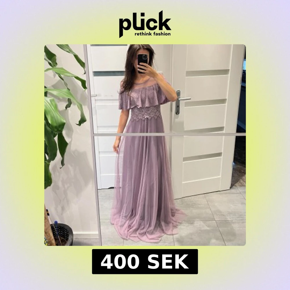 Säljer en drömmig långklänning i lila med glittrigt tyg och vacker spetsdetalj i midjan. Klänningen har korta ärmar och ett svepande fall med volang upptill, perfekt för bal eller fest. Aldrig använd som man kan se på bild 3. Passar S & XS❣️