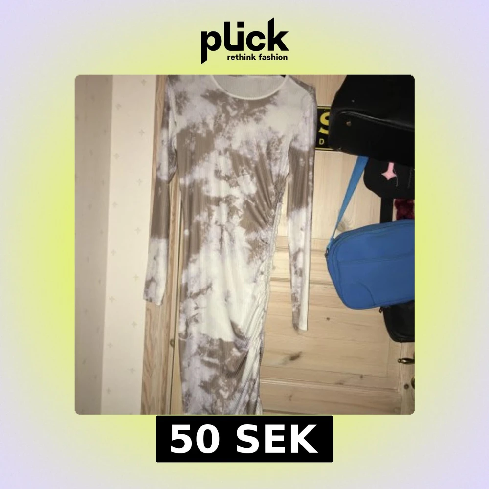 Superfin långärmad klänning i beige och vitt tie-dye-mönster. Klänningen är ribbad och har en snygg snörningsdetalj längs ena sidan som ger en cool rynkad effekt. Perfekt för dig som gillar unika plagg med lite edge. Tror det är storlek S På sidan kan man göra den mindre genom o dra i snöret
