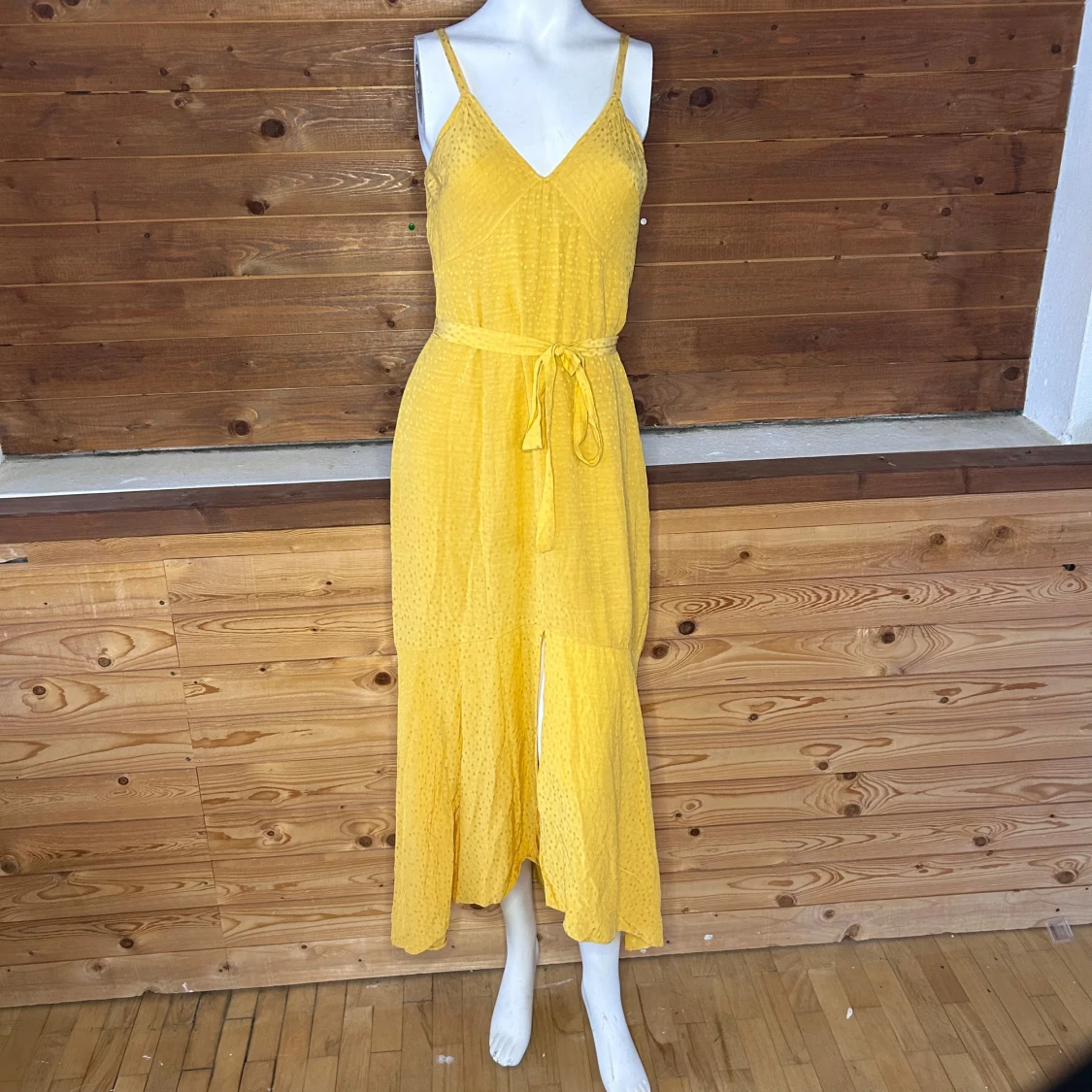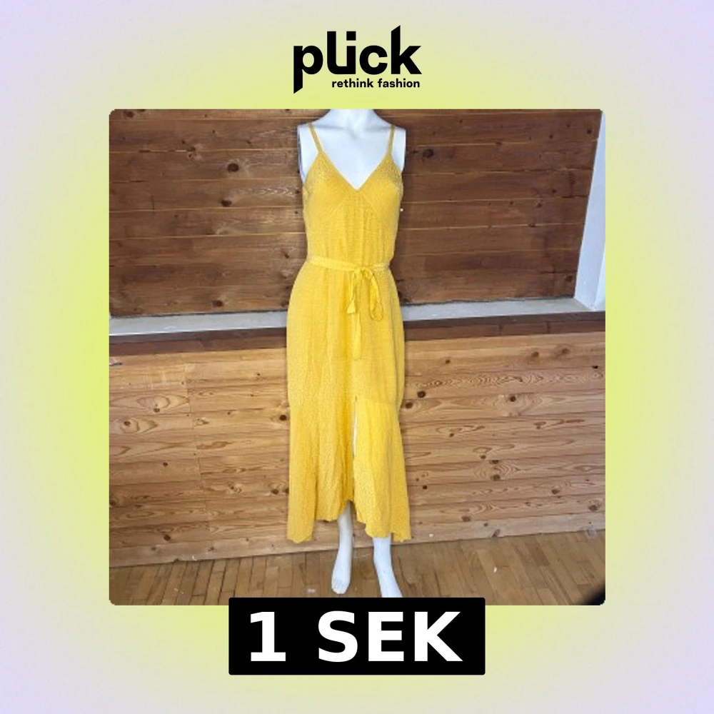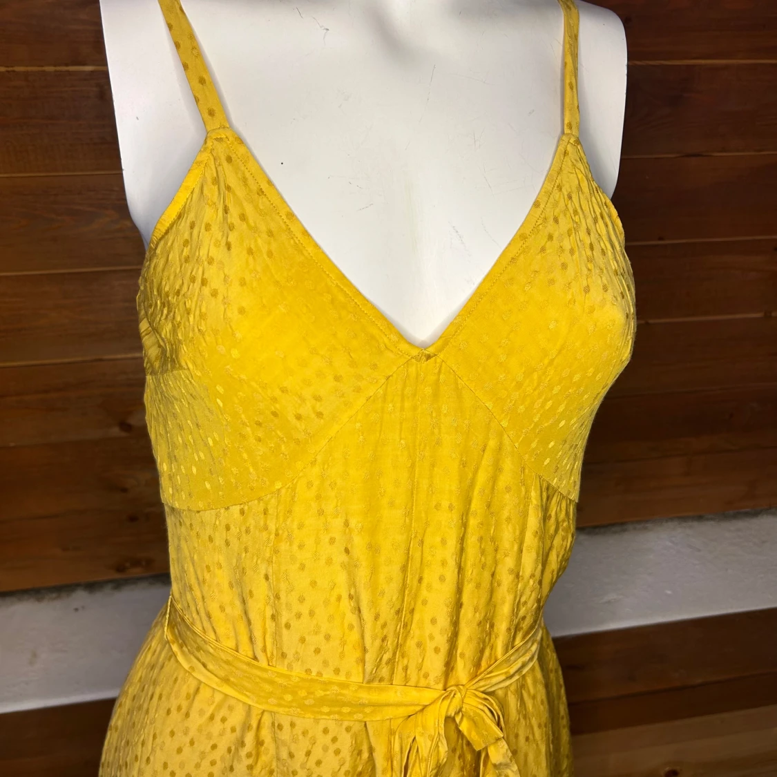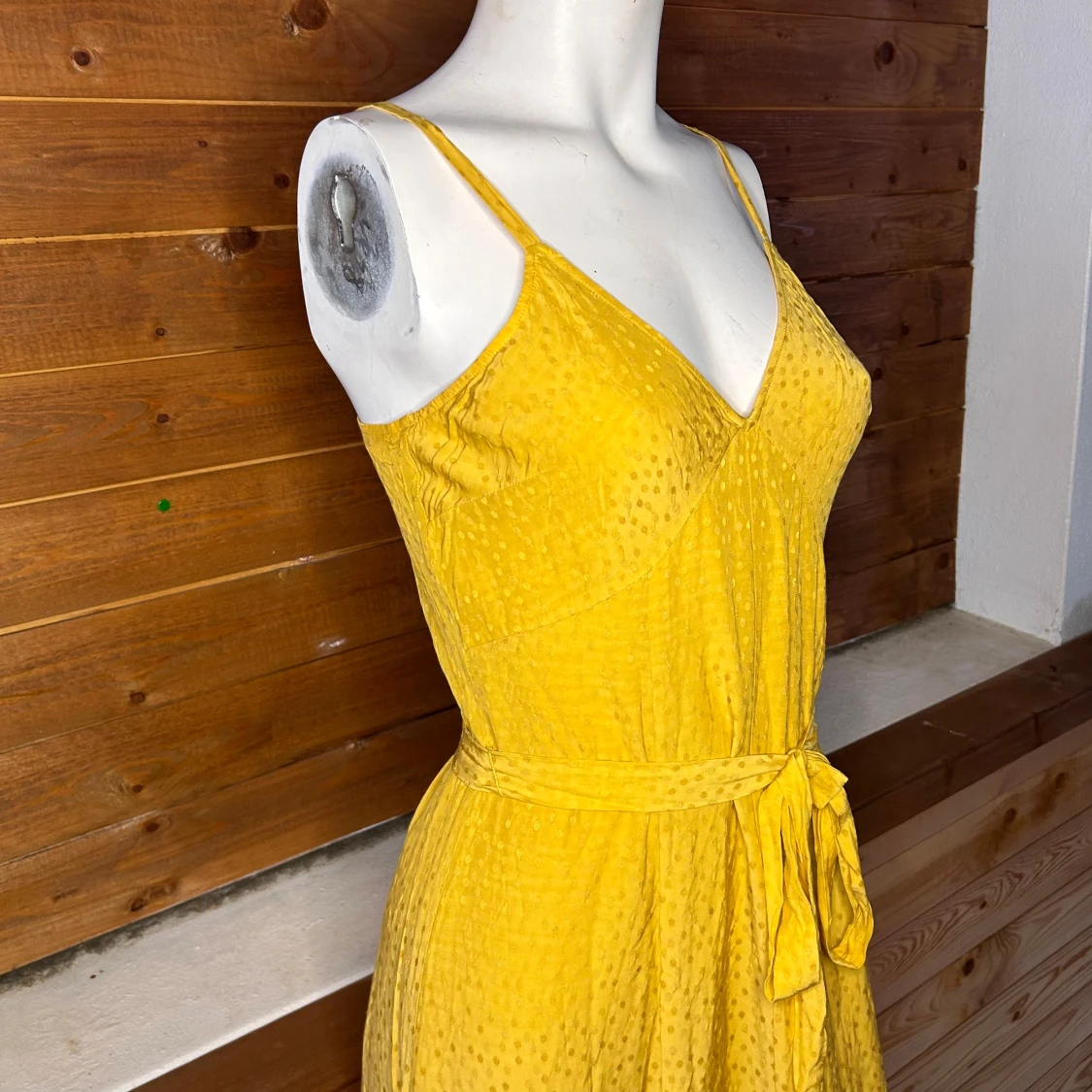 Snygg gul långklänning med smala axelband och v-ringning. Klänningen har ett knytband i midjan för en fin passform och ett diskret prickigt mönster som ger en extra touch. Perfekt för soliga dagar!