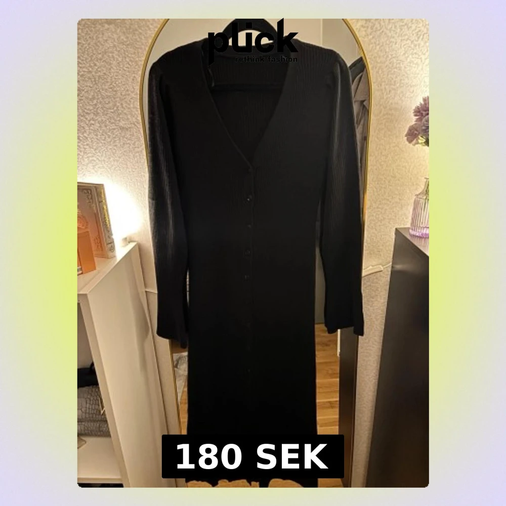 Säljer en svart långklänning i ribbat material med v-ringning och långa ärmar. Klänningen har knappar hela vägen framtill och är figurnära i modellen. Perfekt för dig som gillar stilrena och enkla plagg med en twist.