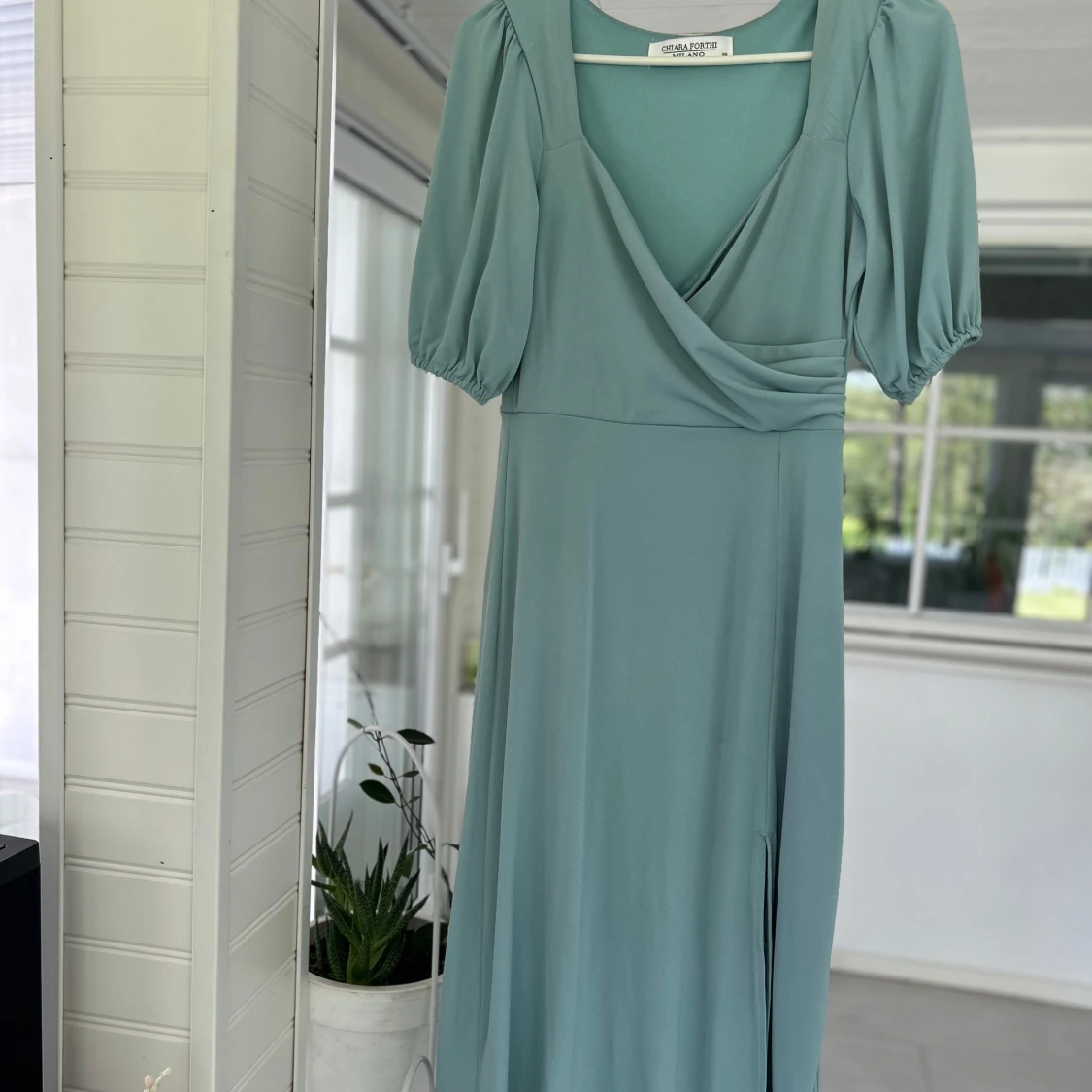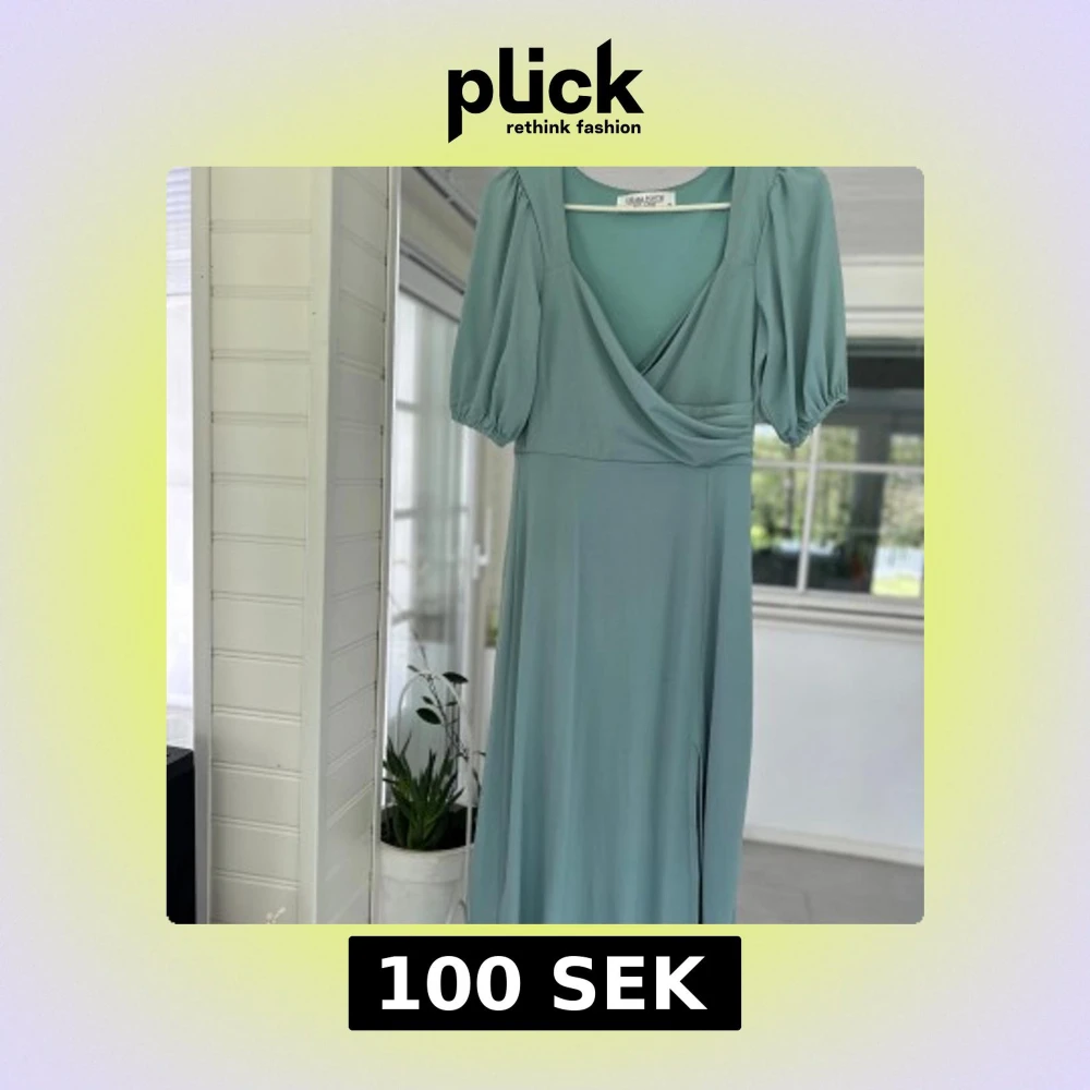 Säljer en ljusblå långklänning med omlott framtill och v-ringning. Klänningen har korta puffärmar och ett mjukt, följsamt tyg som ger ett elegant fall. Perfekt för somriga tillfällen eller studentfirande.