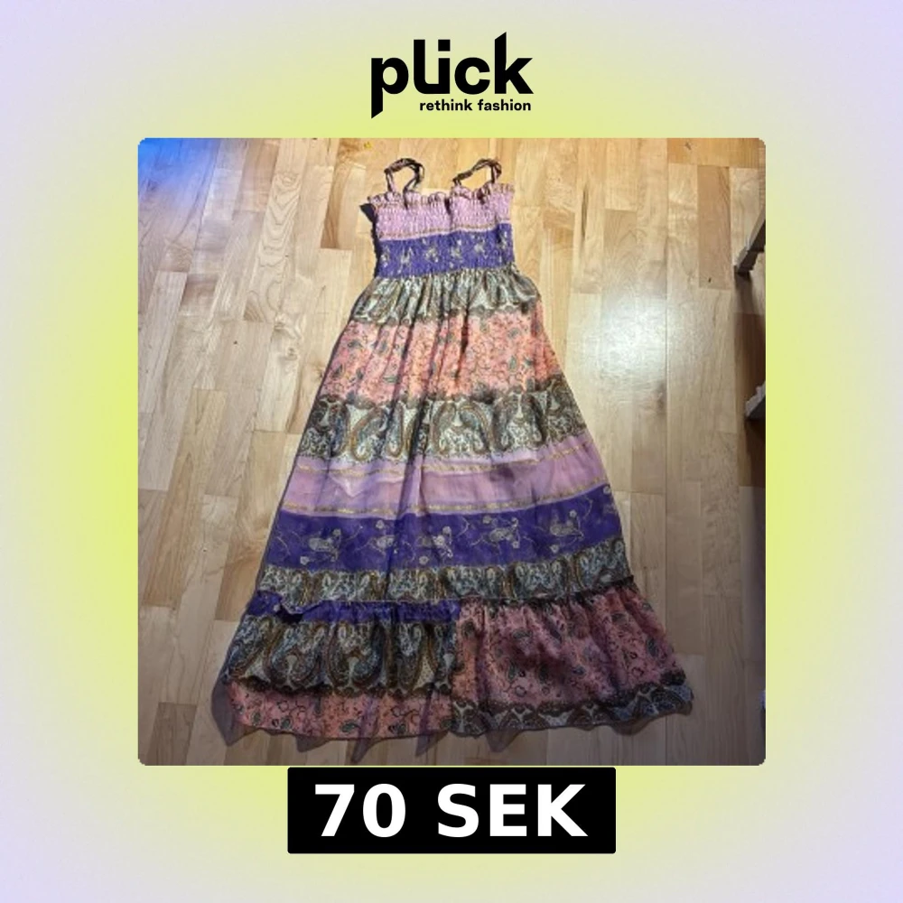 Charmig långklänning med ett färgglatt och bohemiskt mönster i rosa, lila och grönt. Klänningen har smala axelband och volangdetaljer upptill. Perfekt för en somrig dag med sin luftiga design. Pris kan diskuteras!