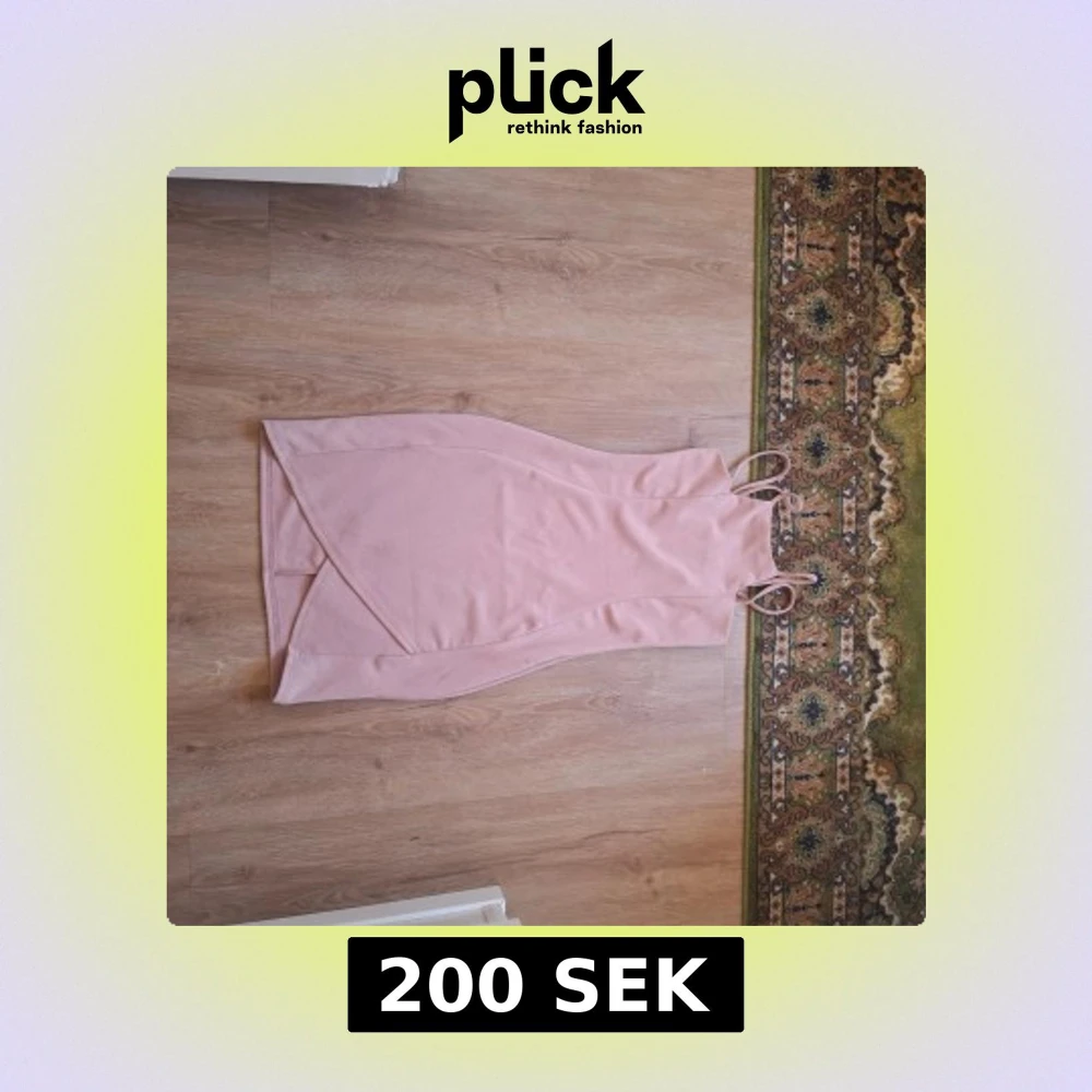Säljer en ljusrosa klänning med smala axelband och omlottdesign framtill. Klänningen har en figurnära passform och är ärmlös, perfekt för sommarens tillfällen. Materialet känns mjukt och stretchigt.