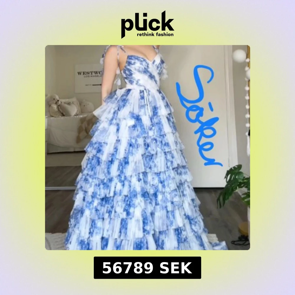 Söker en sån klänning från JJ House eller liknande. Drömmig långklänning i blått och vitt med volanger i flera lager och smala axelband. Klänningen har v-ringning och ett romantiskt, flowy uttryck. Perfekt för dig som vill sticka ut med en unik och somrig look.