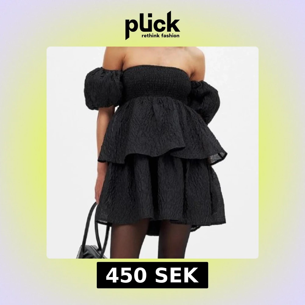 Supersnygg svart kortklänning med puffärmar och stor rosett i ryggen. Klänningen har en offshoulder-design och är tillverkad i ett krinklat syntetmaterial som ger cool struktur. Volangdetaljer och omlottkänsla baktill gör den extra unik. Perfekt för dig som vill sticka ut.