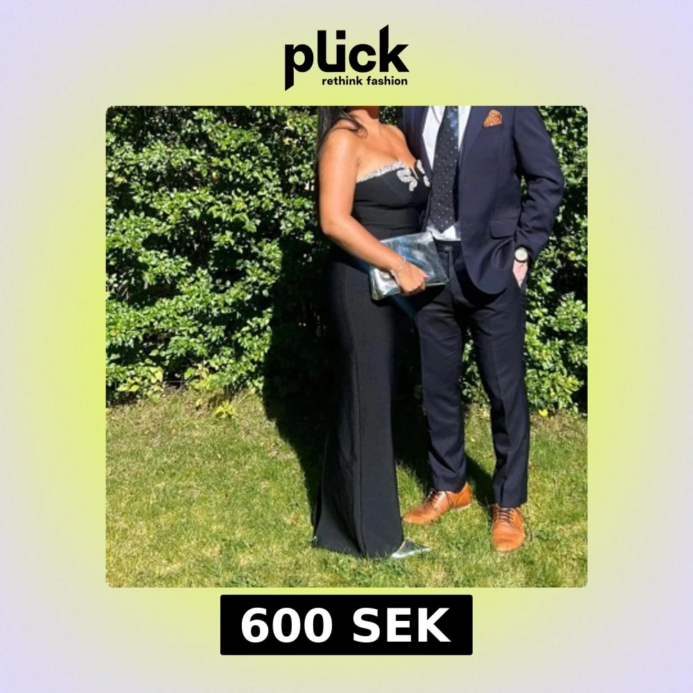 Säljer en svart axelbandslös långklänning med glittrande paljettdetaljer längs överdelen. Klänningen har en snygg slits bak och figurnära passform som framhäver siluetten. Perfekt för bal eller fest.