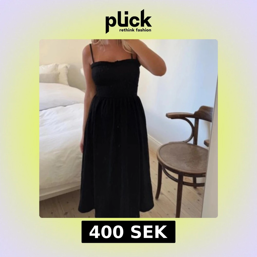 Säljer en stilren svart axelbandslös klänning med smala axelband. Klänningen har en smockad överdel som ger en bekväm passform och en luftig kjol som faller fint. Perfekt för varma dagar eller kvällar. Jättesnygg
