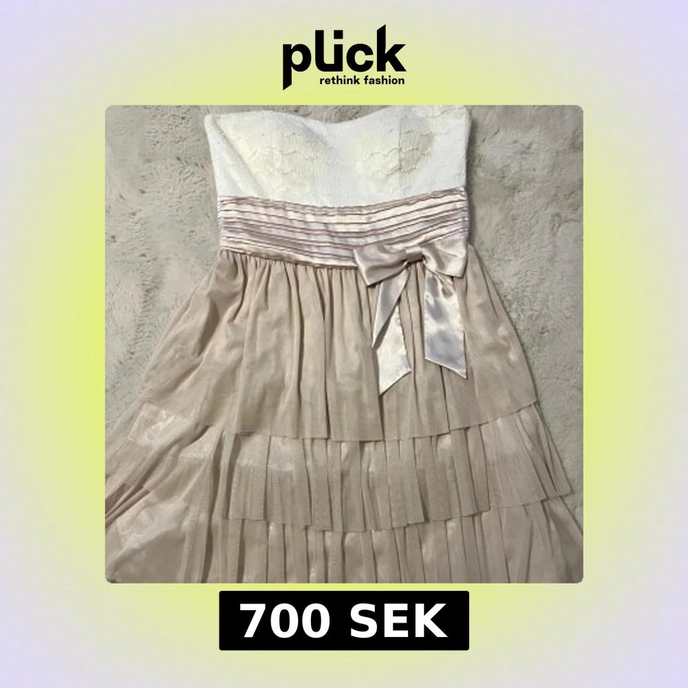 Söt axelbandslös klänning i vitt och ljusrosa med volanger och en bred satinrosett i midjan. Överdelen är vit med diskret struktur, midjan markerad med randigt satinband och kjolen har flera lager för extra volym. Perfekt för skolavslutning eller studenten