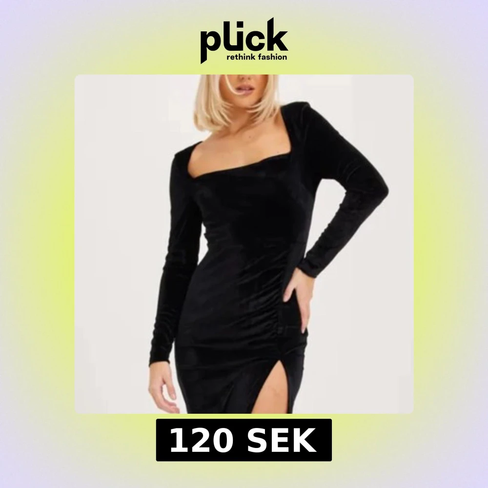 Elegant svart klänning i sammet med långärmad design och en stilfull slits. Perfekt för en kväll ute. Den är helt oanvänd och prislapp sitter kvar