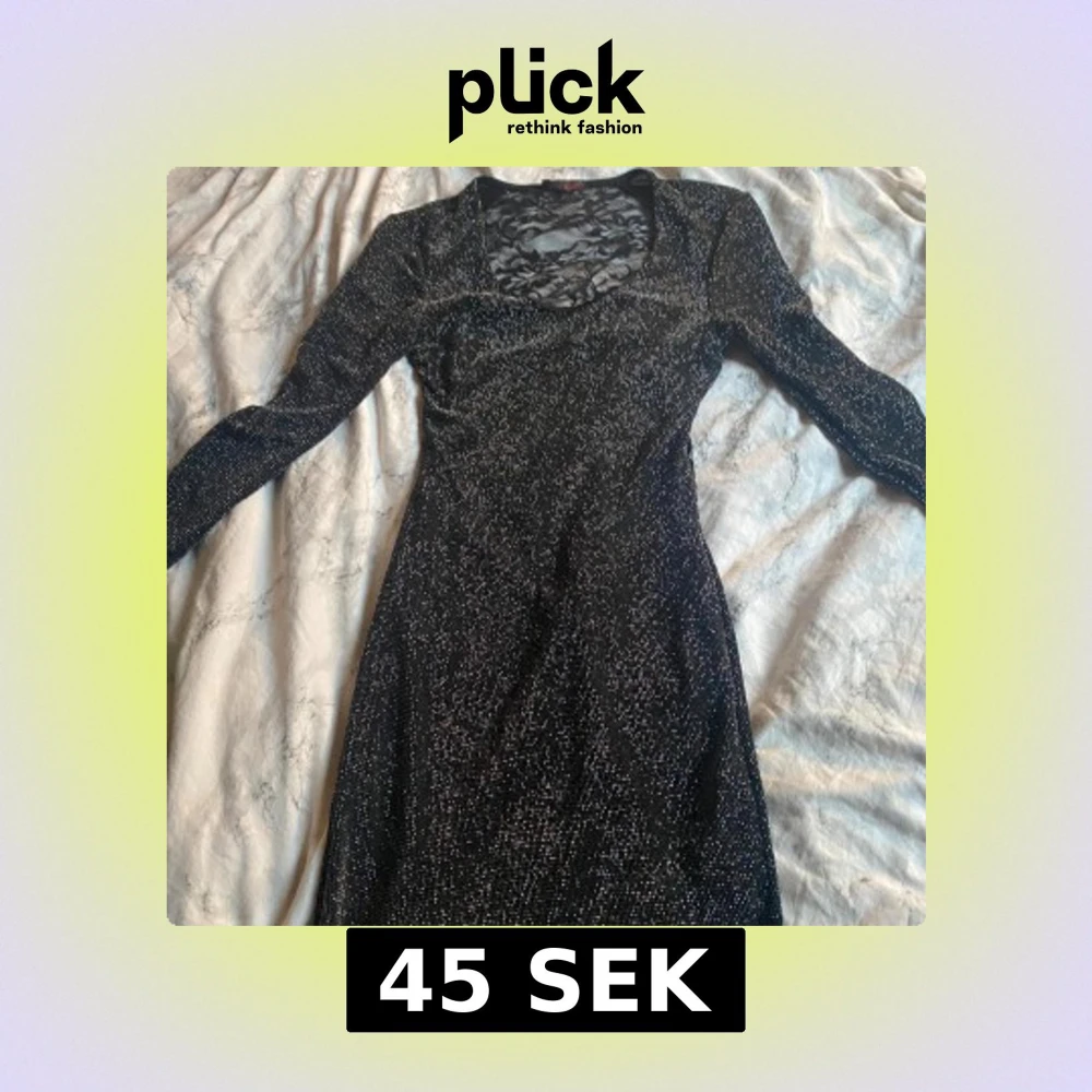 Supersnygg svart klänning med glittriga detaljer och långärmade ärmar. Baksidan har en stor spetspanel med blommigt mönster som ger en cool kontrast. Klänningen är figurnära och har en v-ringad halsringning framtill. Perfekt för dig som vill sticka ut med lite extra glitter.En super fin fest/ ny års klänning😍 + 60kr Frakt