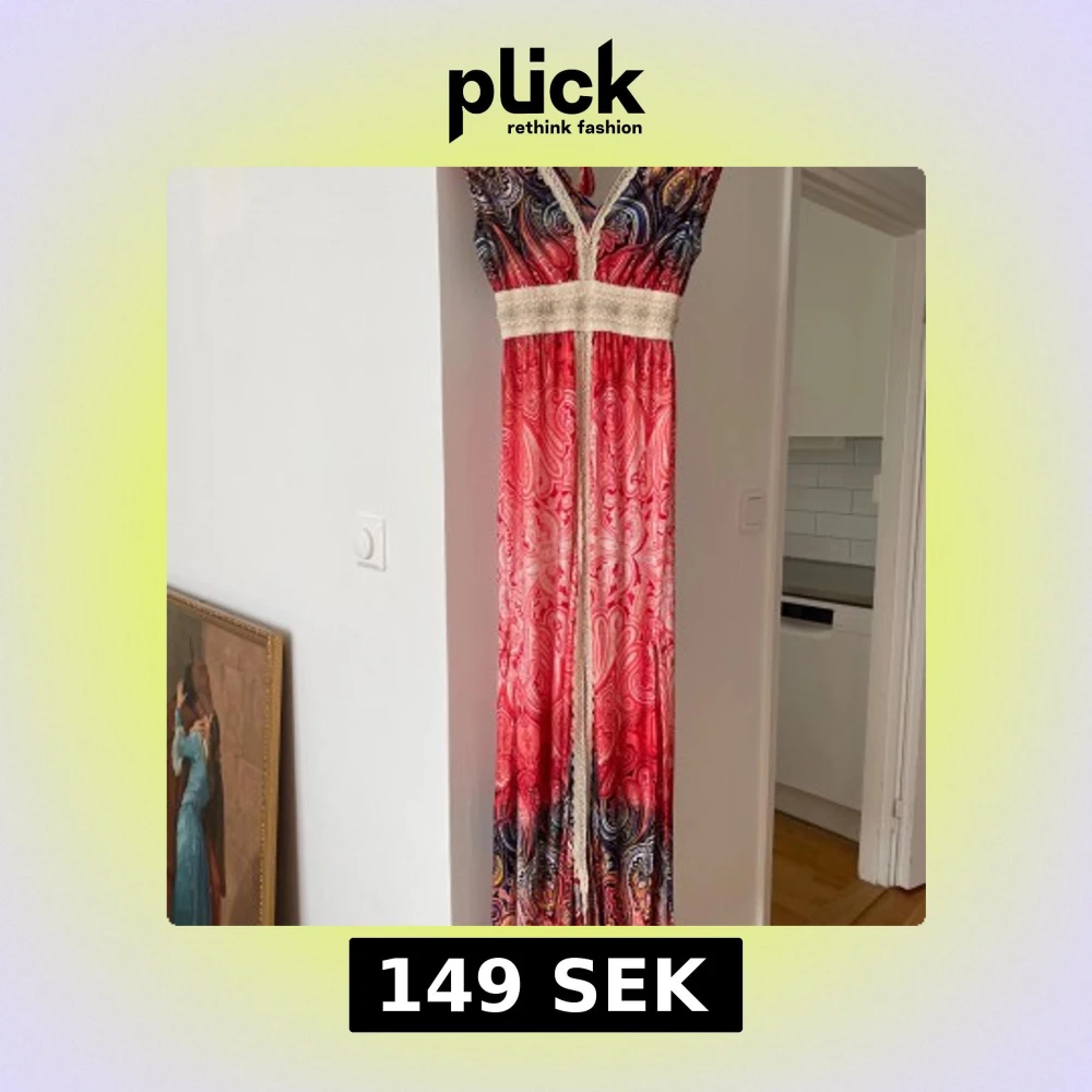 Säljer en färgstark långklänning med spetsdetaljer och knyt i nacken. Midjan är markerad med ett brett spetsband och tyget är mjukt och följsamt. Köpt i Grekland nypris 499.