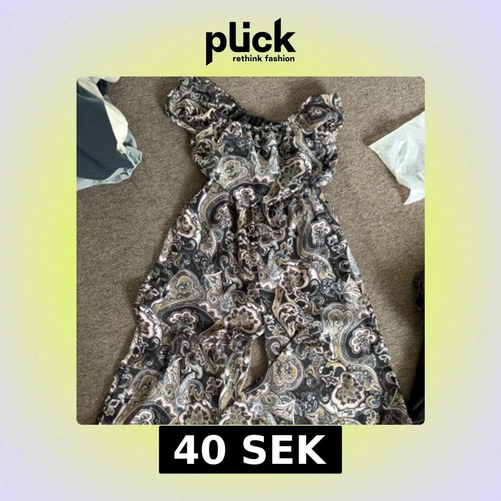 Säljer en svart jumpsuit med paisleymönster i beige, blått och ljusrosa. Jumpsuiten har offshoulder-ärmar med resår och ett luftigt fall. Materialet känns som polyester och har en mjuk innersida. Perfekt för dig som gillar boho-vibe och detaljerade mönster.