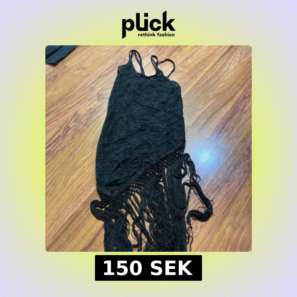 Supersnygg svart klänning med smala axelband, spetsdetaljer och långa fransar nedtill. Klänningen har en asymmetrisk nederkant och är täckt av blommig spets, vilket ger en unik och trendig look. Perfekt för dig som vill sticka ut med en cool och elegant stil.