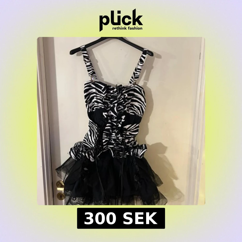 Snygg zebramönstrad klänning med volanger och spetsdetaljer. Axelbandslös design med snörning framtill och en fluffig kjol i flera lager. Perfekt för en unik och djärv stil.