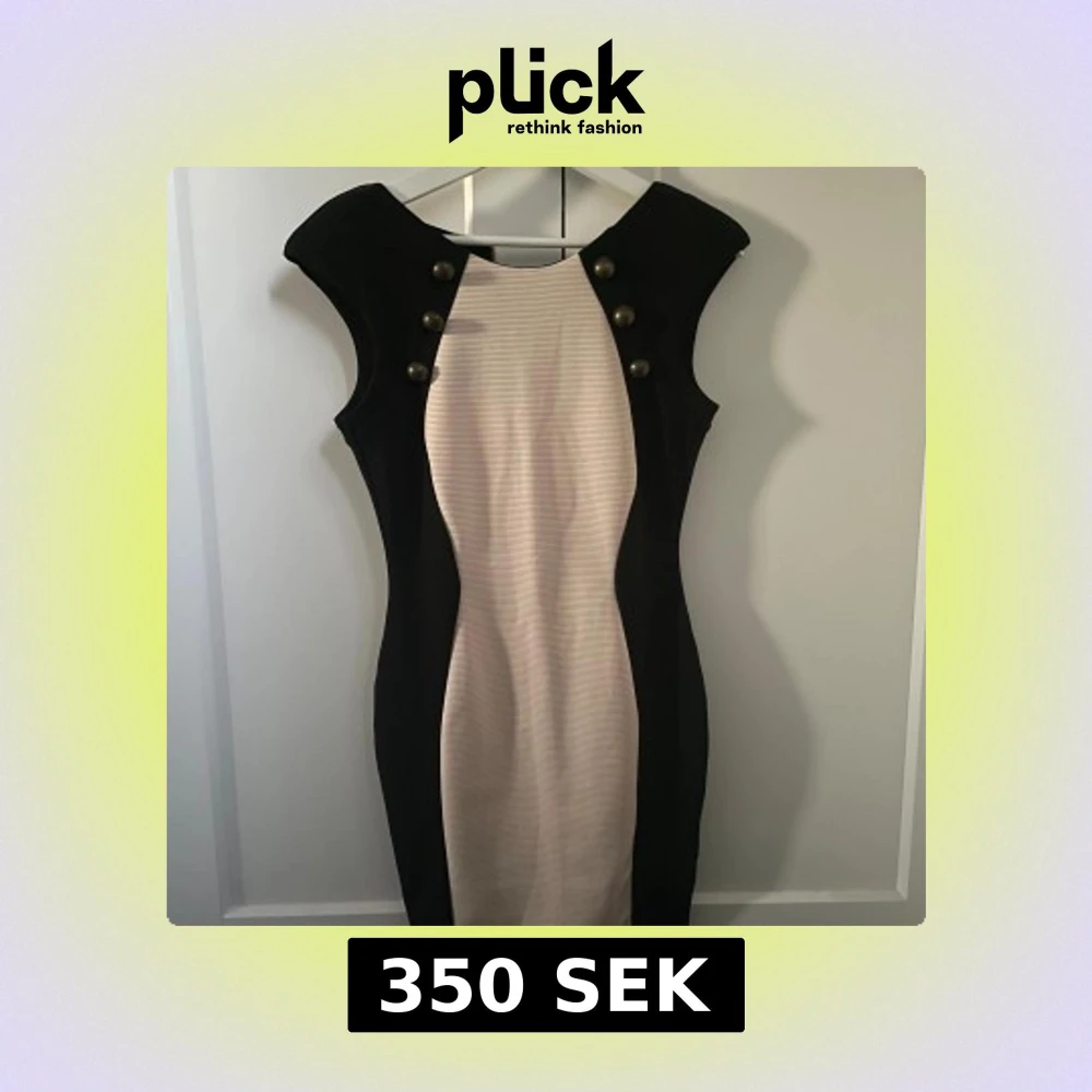 Snygg kortklänning i svart och beige med markerade axlar och dekorativa knappar framtill. Klänningen har en figurnära passform och är ärmlös och stretchig i materialet!