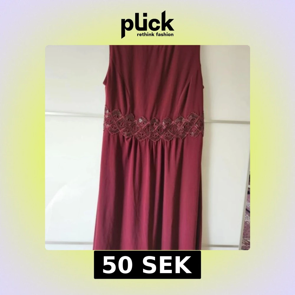 Vinröd långklänning med vacker spetsdetalj i midjan. Klänningen är ärmlös och har en elegant, enkel design som passar perfekt till festliga tillfällen.