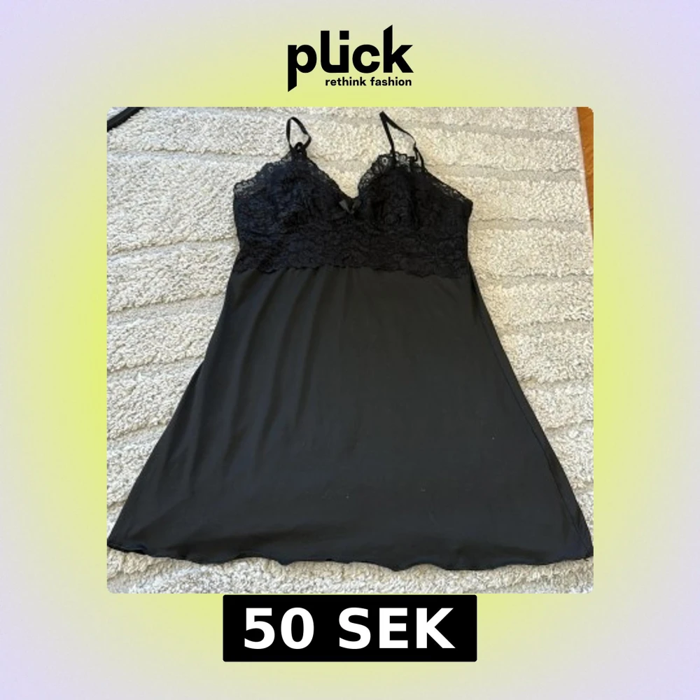 Säljer en svart klänning med spets upptill och tunna justerbara axelband. Klänningen har en liten rosett framtill och är ärmlös med en mjuk, slät kjoldel. Perfekt för dig som gillar en feminin och elegant stil.
