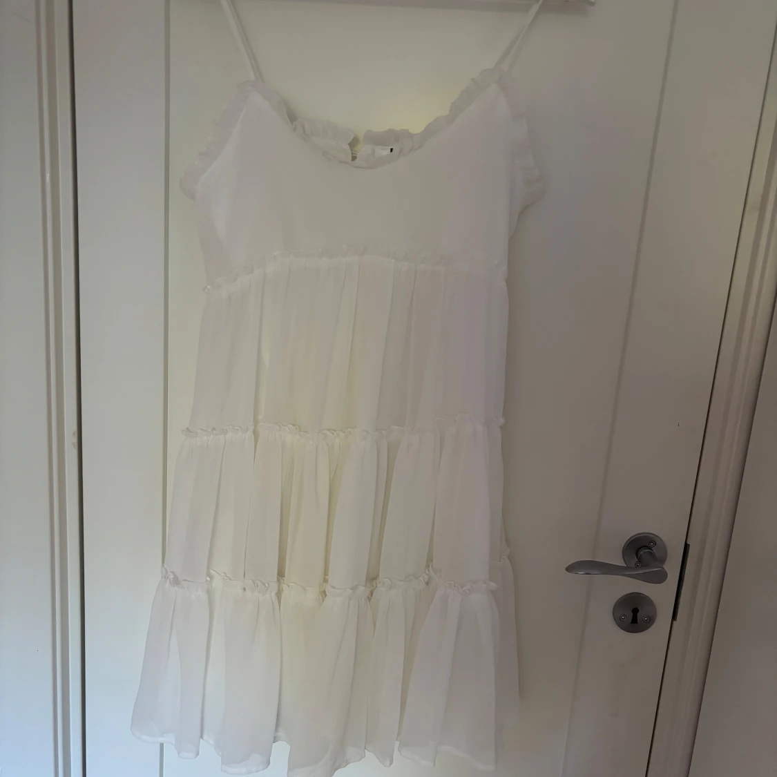 Superfin vit kortklänning från DM Retro med tunna axelband, volanger och knappar i ryggen. Klänningen har flera lager med rynkade volanger och en luftig känsla, perfekt för varma dagar. Söt och romantisk stil som passar till sommarens alla tillfällen.