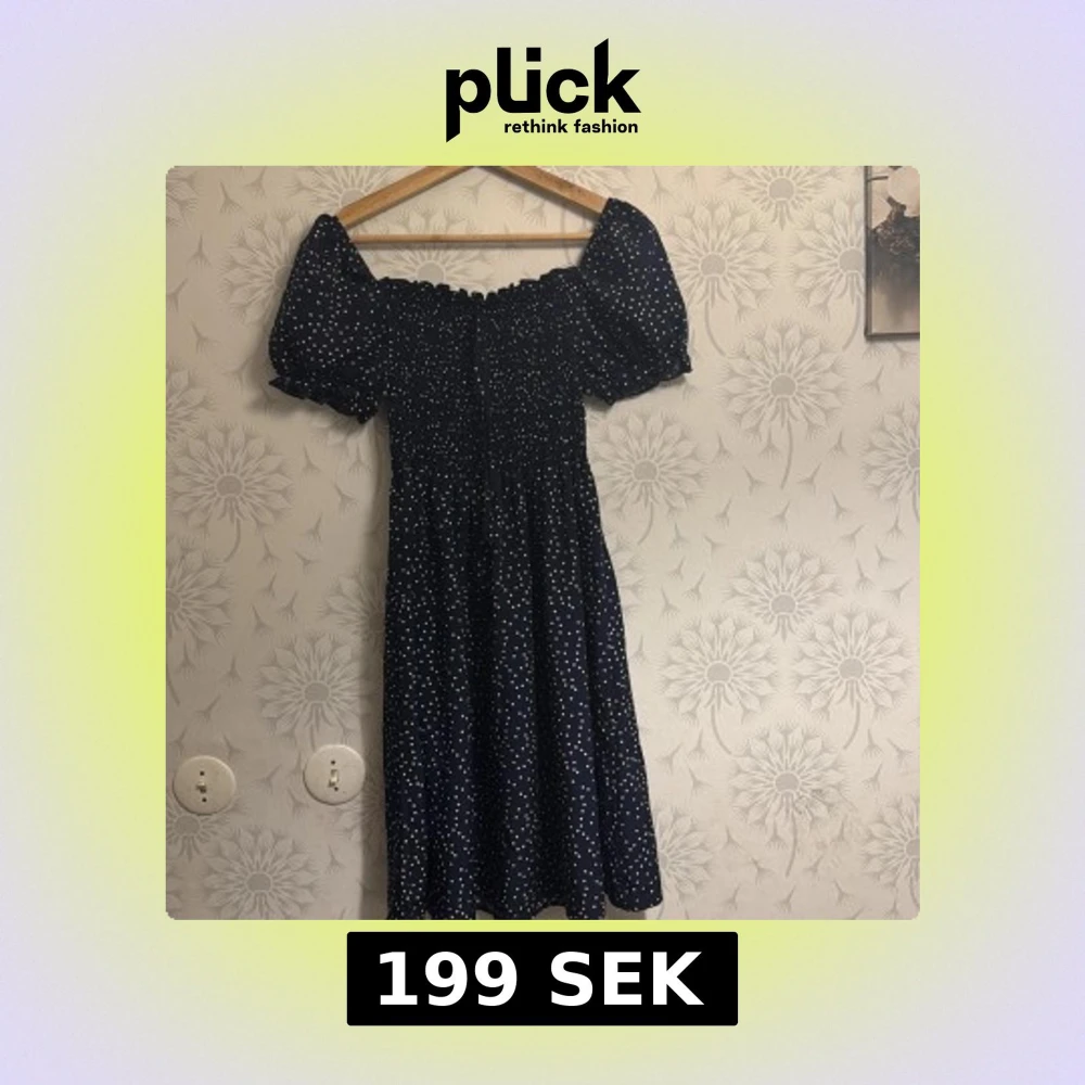 Charmig mörkblå klänning med vita prickar och puffiga kortärmar. Den har en smockad överdel som ger en bekväm passform och en luftig kjol. Perfekt för en somrig look!