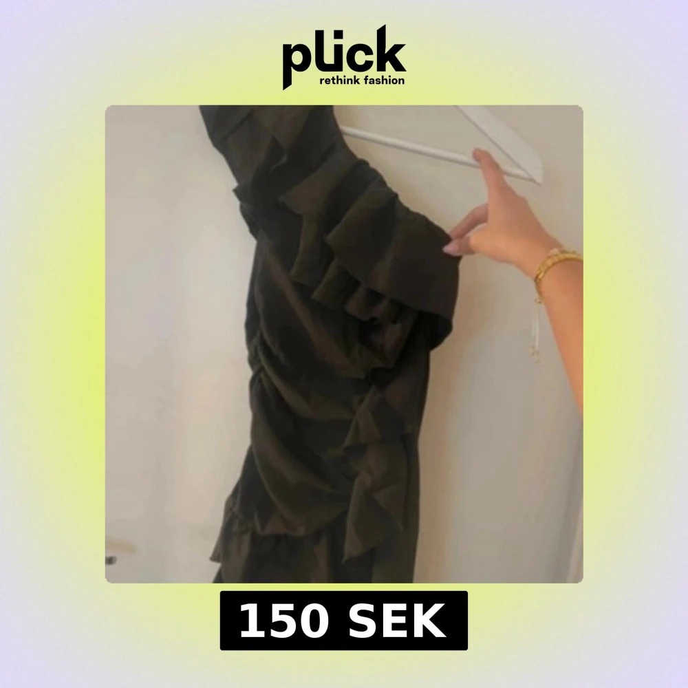 Snygg svart kortklänning med omlott-design och volangdetaljer längs hela klänningen. Klänningen har oneshoulder och är tillverkad i ett lätt, mjukt material som ger en elegant känsla. Perfekt för dig som vill sticka ut med en trendig look.