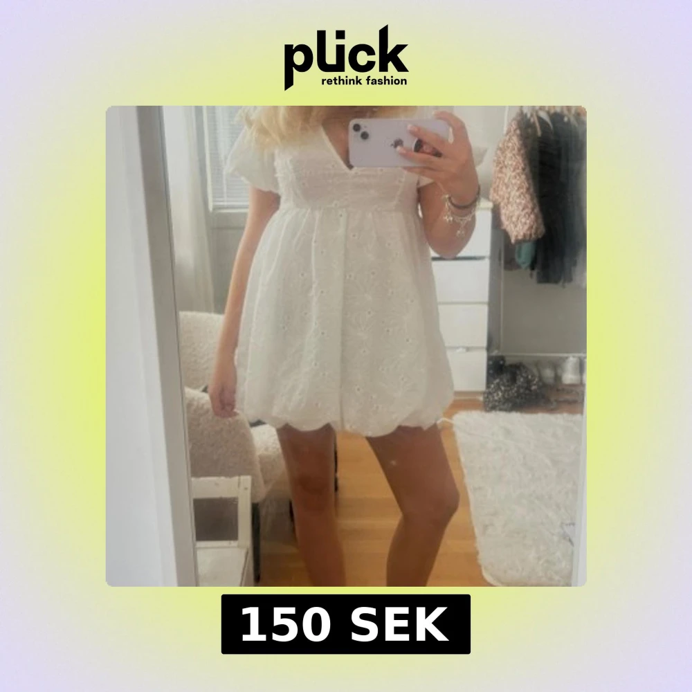 Supersöt vit kort klänning med puffärmar och v-ringning. Klänningen har broderade blommor och en ballongformad kjol. Perfekt för sommarens alla tillfällen typ student eller skolavslutning!!!