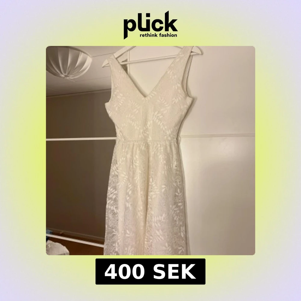 Elegant vit klänning i spets med v-ringad design. Fin till skolavslutningen eller till konfirmation. Hör av er vid funderingar eller om ni vill ha bilder med hur plagget sitter på mig. Titta gärna in mina andra plagg!