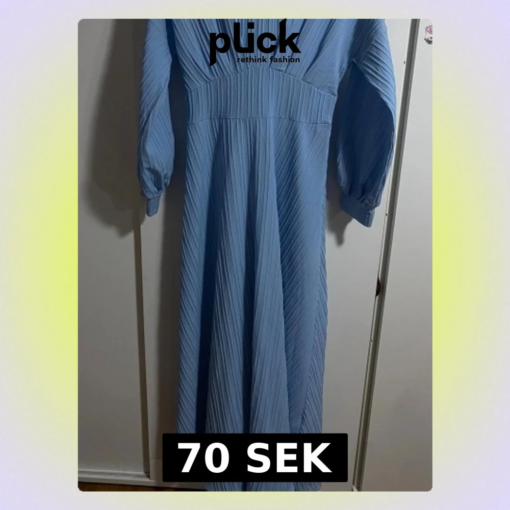 Säljer en ljusblå långklänning med plisserat tyg och långärmade ärmar. Klänningen har en markerad midja och ett snyggt fall. Stängs med dragkedja i ryggen och har en elegant, stilren look som passar perfekt till vår och sommar. Den snatchar midjan perfekt