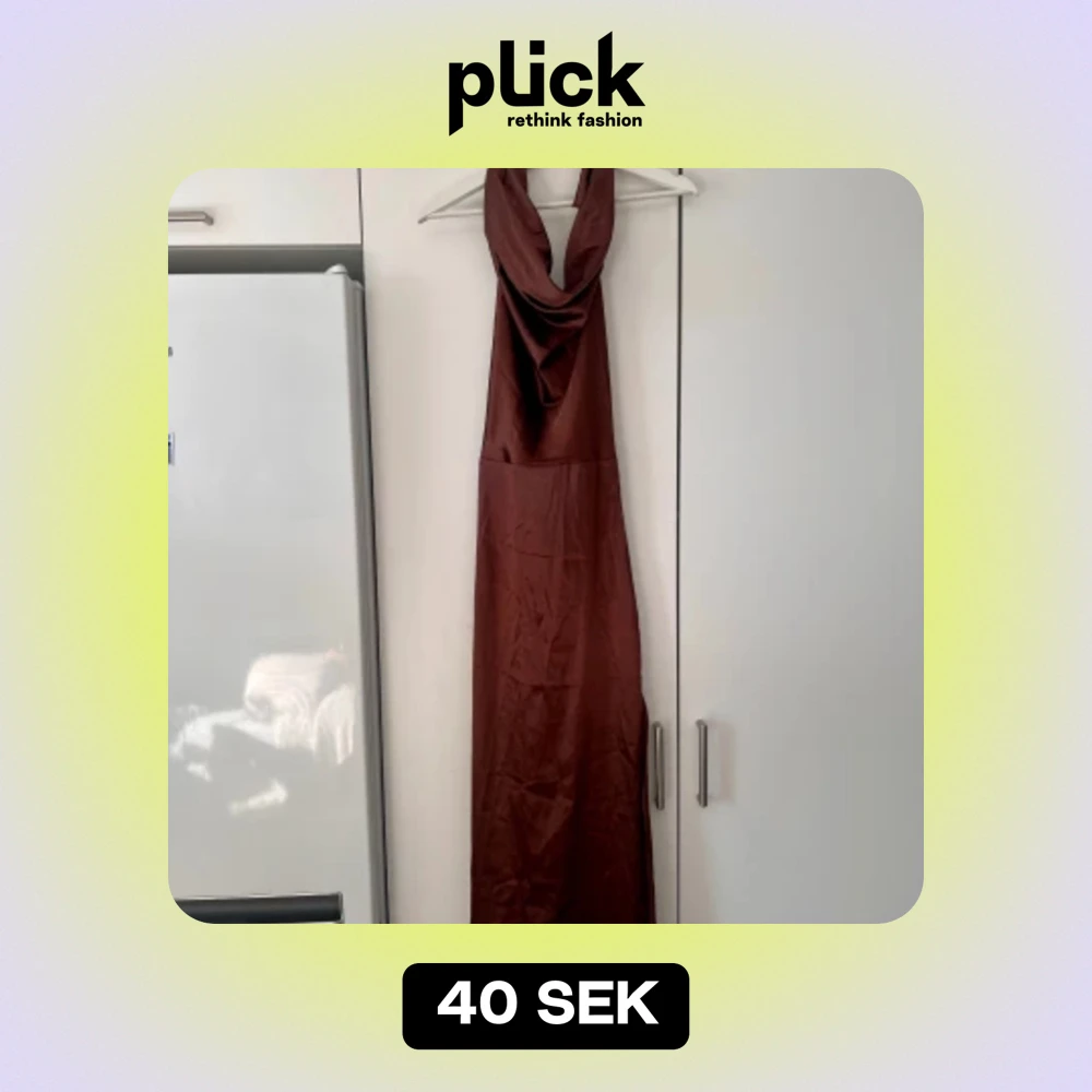 Satinklänning med halterneck, öppen rygg och slits på båda sidorna. Klänningen hade från början en silverkedja i ryggen som jag tog bort. Den går under knäna på mig som är 173 cm.