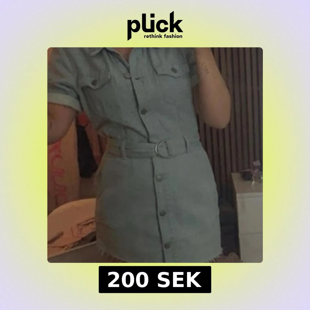 Säljer en snygg kort jeansklänning med knappar framtill och tillhörande bälte i midjan. Klänningen har korta ärmar med uppvik och två bröstfickor. Perfekt för en trendig och avslappnad look.