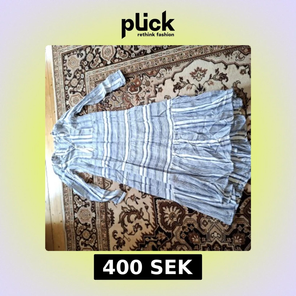 Säljer en luftig långklänning med blå och vita ränder. Klänningen har lång ärm och volangdetaljer nertill. Perfekt för varma dagar och har en avslappnad passform. Materialet känns mjukt och svalt mot huden.