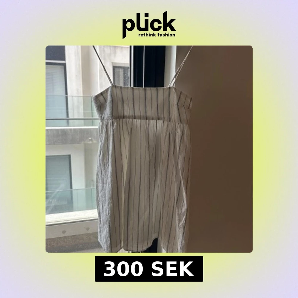 Säljer en söt vit klänning med svarta ränder och tunna axelband. Klänningen har en rak överdel och faller löst från bysten, perfekt för varma dagar. Enkel och stilren design som passar till många tillfällen.