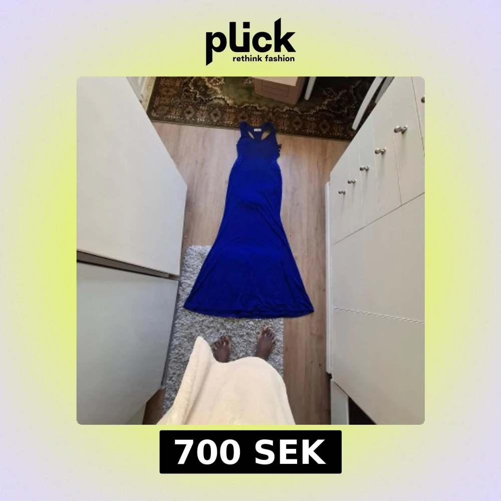 Säljer en kornblå långklänning med v-ringning och breda axelband. Klänningen har en figurnära passform upptill och är utsvängd nertill. Snygga detaljer i form av mesh och små paljetter vid midjan. Perfekt för dig som vill sticka ut.