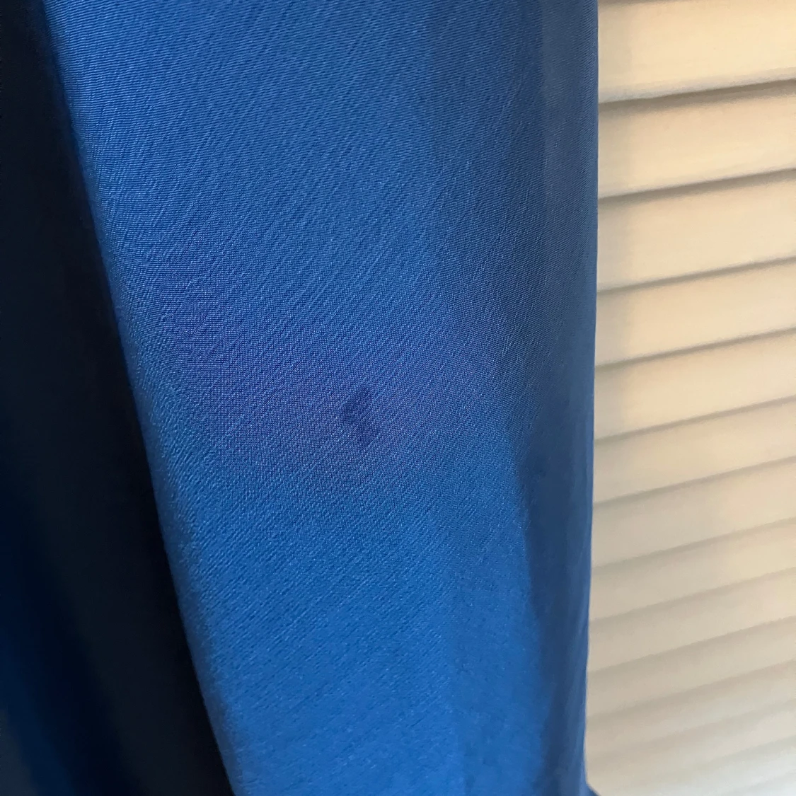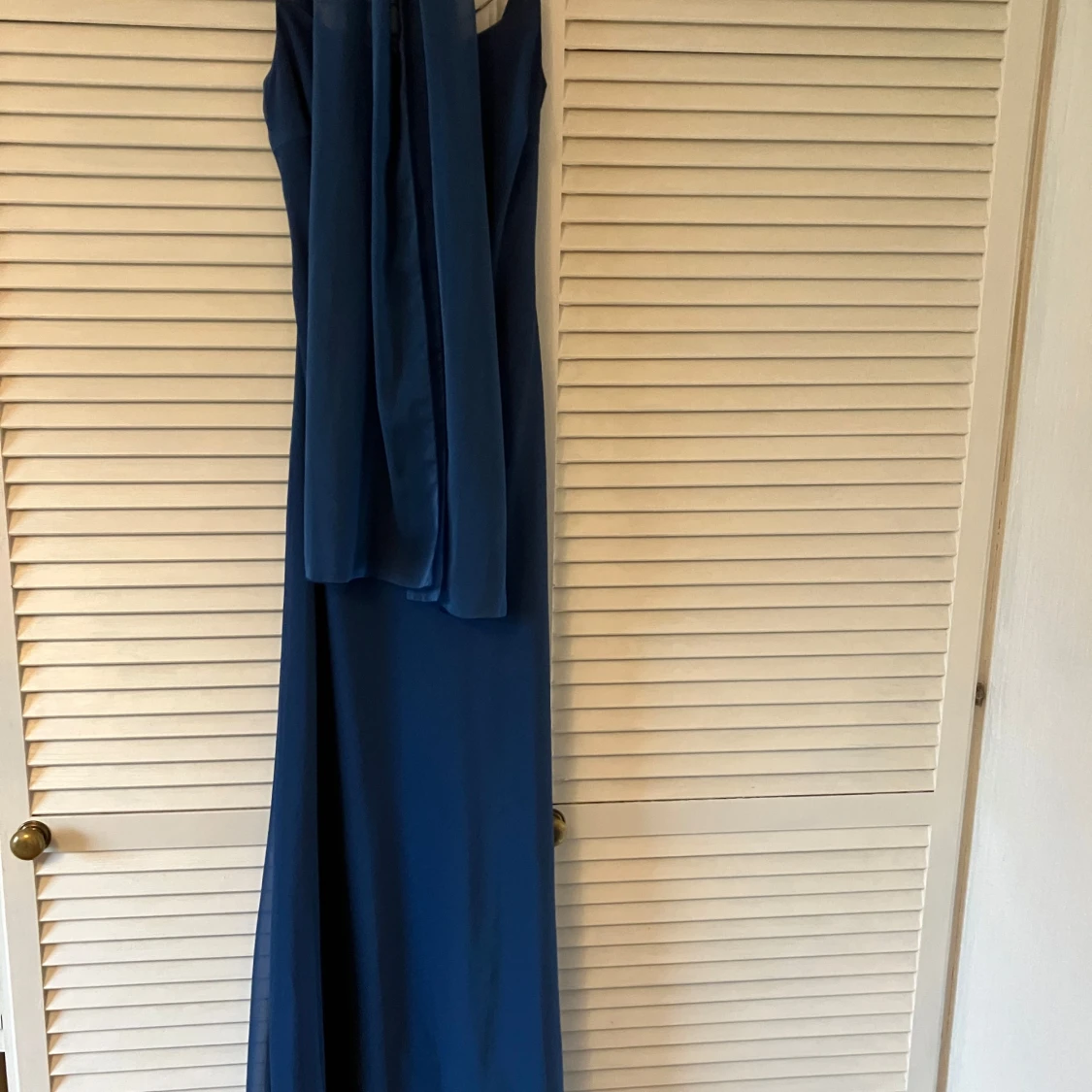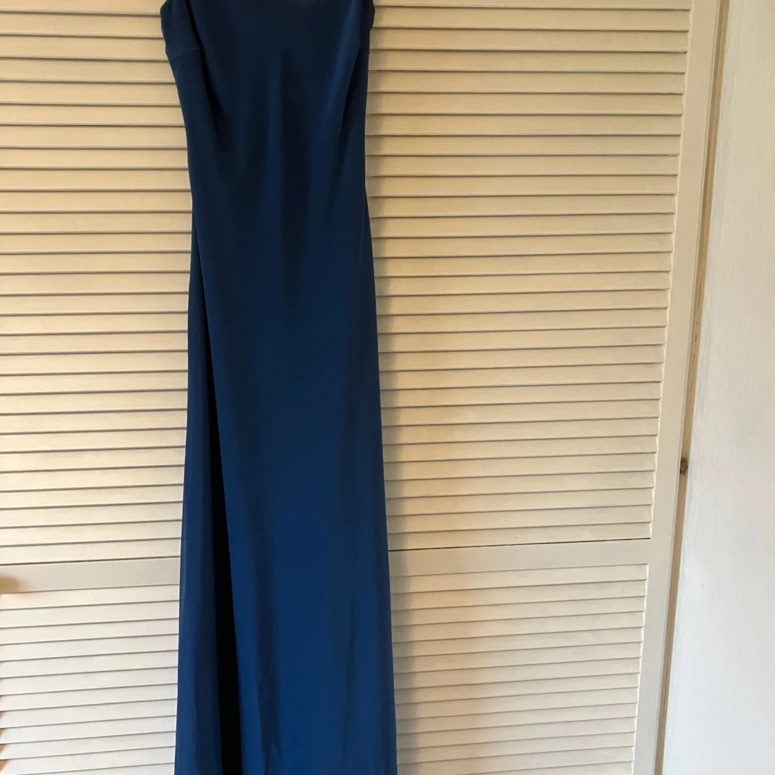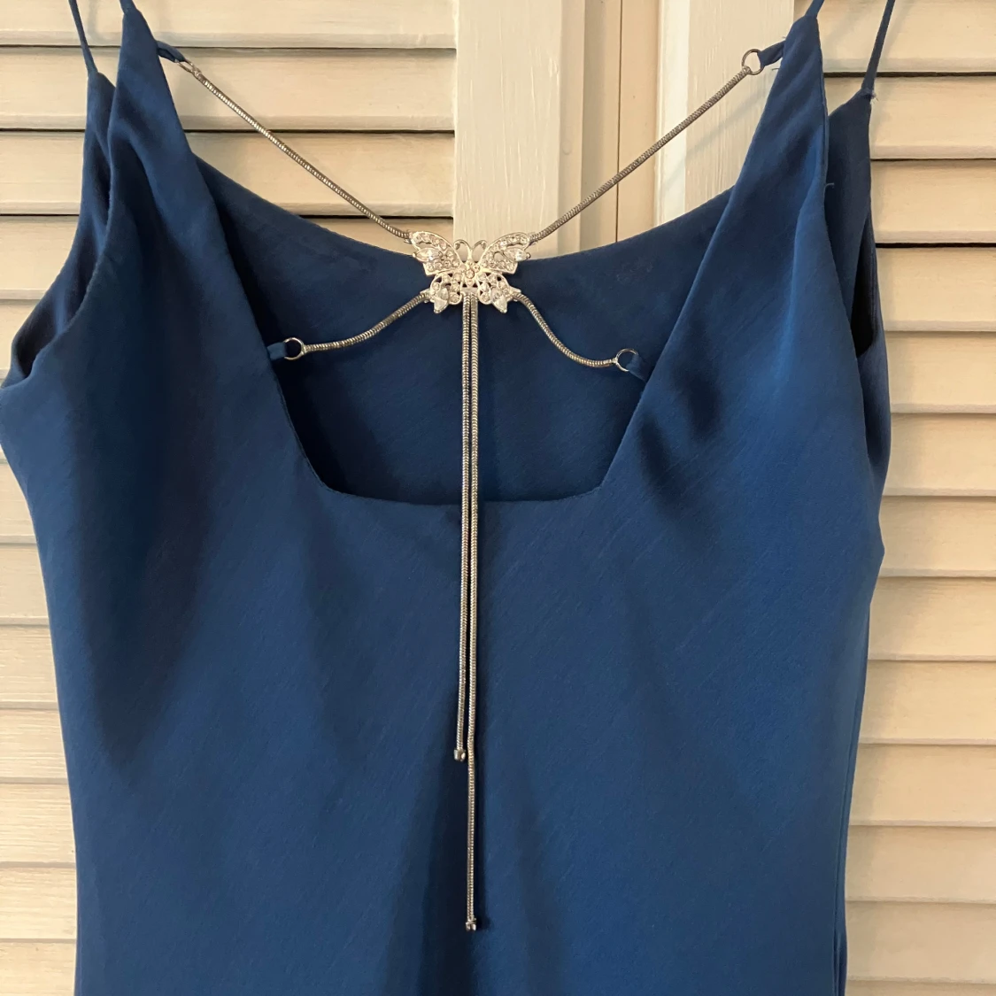 Elegant blå långklänning med smala axelband och dekorativ kedjedetalj i ryggen. Klänningen har en rak, slimmad passform och är perfekt för festliga tillfällen. Materialet har en lätt glans och ger ett stilrent intryck. Obs - finns fläckar, kanske går bort i tvätt.