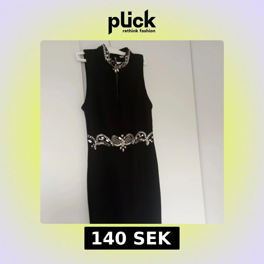Supersnygg svart ärmlös klänning med hög krage och glittrande pärldetaljer vid halsen och midjan. Klänningen har en markerad dragkedja bak och coola. Perfekt för dig som vill sticka ut med en elegant och edgy look.