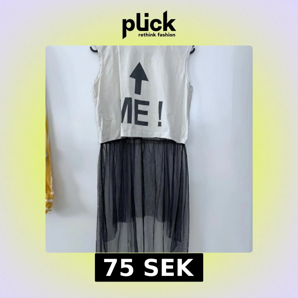 Cool klänning med vit ärmlös topp och svart texttryck framtill, samt en lång, svart transparent kjol i mesh. Toppdelen har ett stort tryck med pil och texten 'ME!'. Perfekt för dig som vill sticka ut.