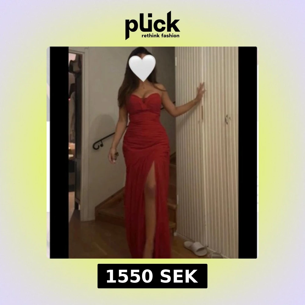 Säljer en elegant röd långklänning med hjärtformad urringning och slits framtill. Klänningen är axelbandslös och har en figurnära passform som framhäver siluetten. Perfekt för bal eller festkvällar. Fallet på klänningen är magisk.Storlek S.