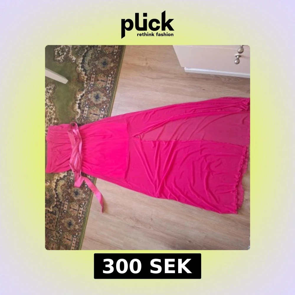 Säljer en snygg rosa långklänning med markerad midja och bred rosett i satinband. Klänningen har en hög slits på sidan och är tillverkad i ett lätt, flowy material. Perfekt för festliga tillfällen!