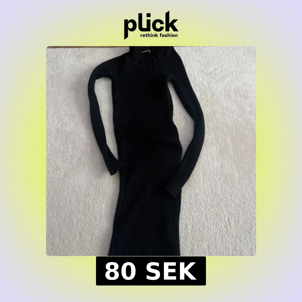 Säljer en svart ribbad kortklänning med lång ärm och polokrage. Klänningen är egentligen väldigt stretchig och har en stilren look som passar perfekt till kyligare dagar. Enkel att styla med boots eller sneakers.