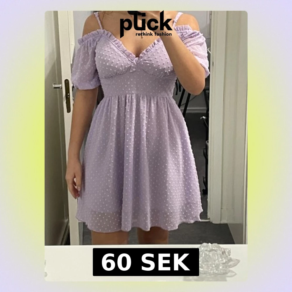 Superfin ljuslila kortklänning med prickigt mönster och offshoulder-ärmar.