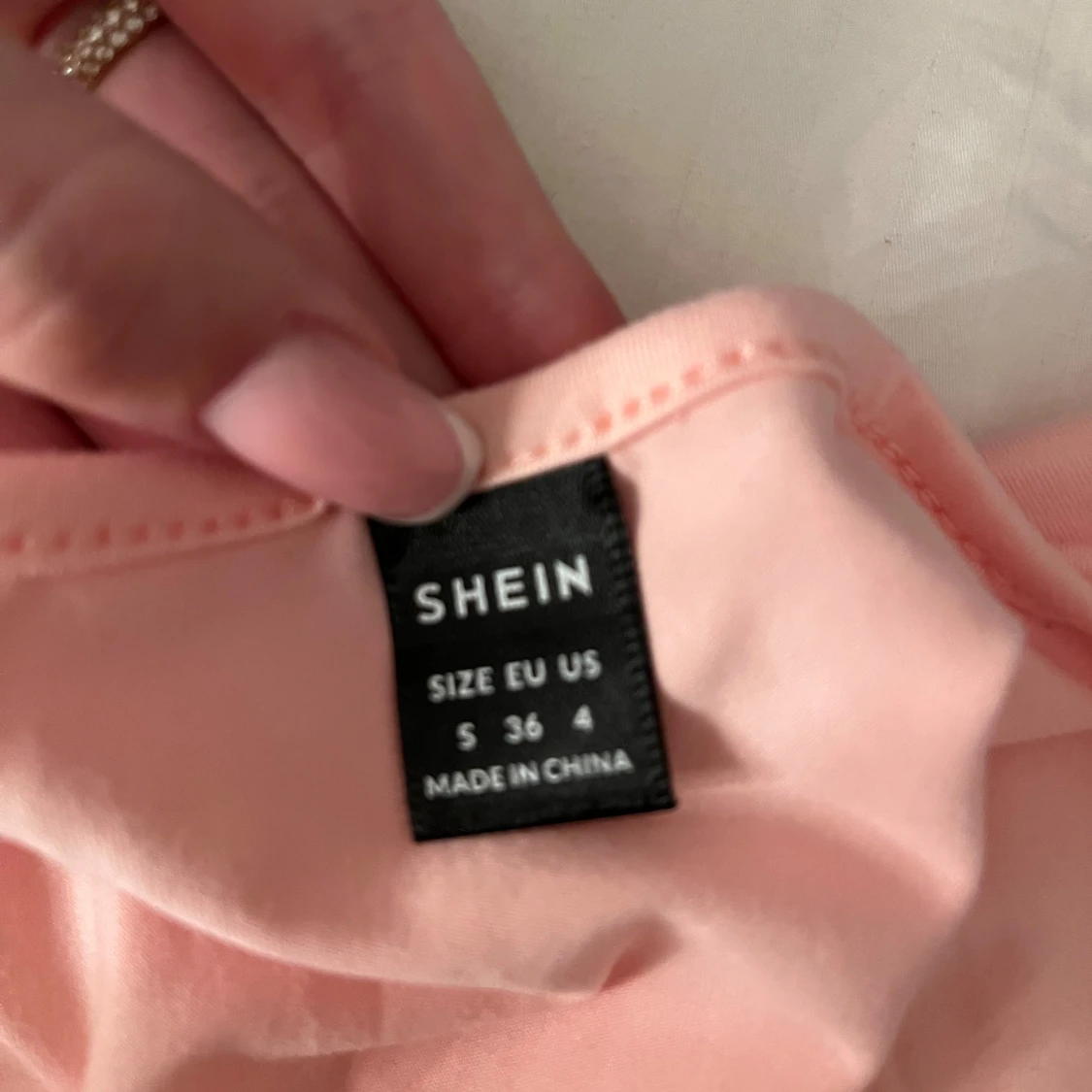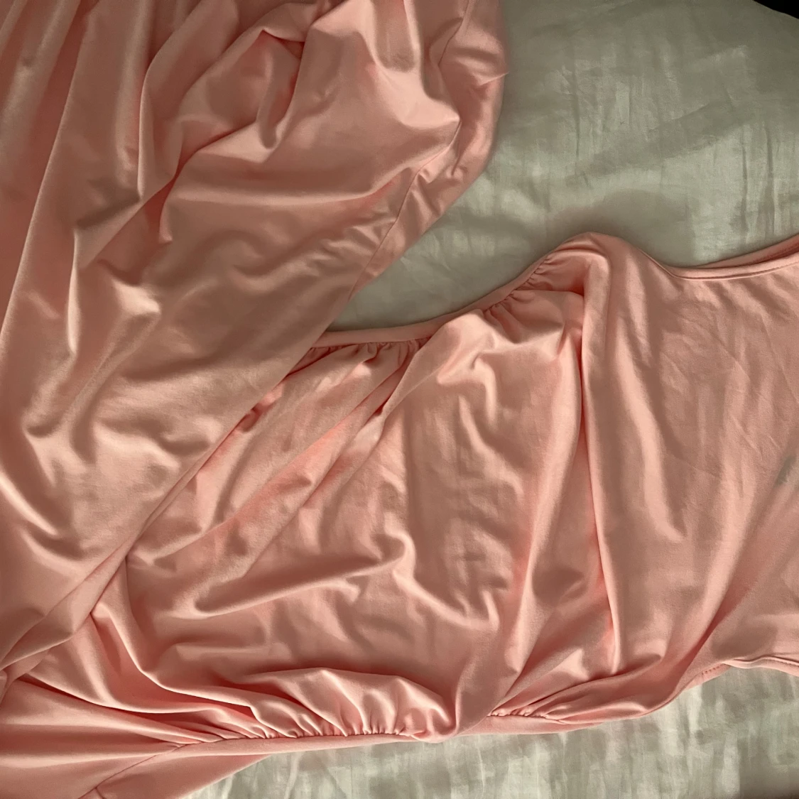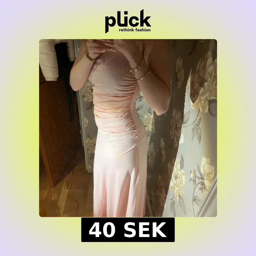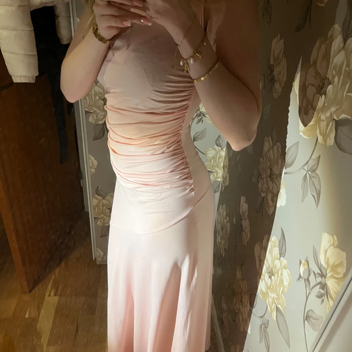 Supersnygg ljusrosa långklänning från SHEIN i storlek S. Klänningen har figurnära passform med rynkade detaljer längs sidorna och är ärmlös med smala axelband. Materialet är mjukt och stretchigt, troligtvis polyester, vilket ger en skön känsla och fin lyster.