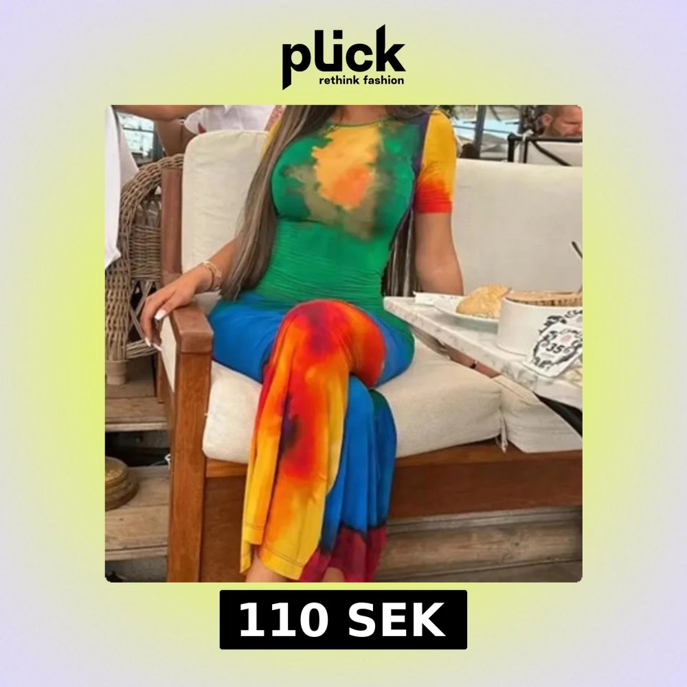Säljer en supercool långklänning med batikmönster. Klänningen har en tight passform och är kortärmad, perfekt för dig som gillar färg och vill sticka ut. Materialet känns mjukt och följsamt mot kroppen.