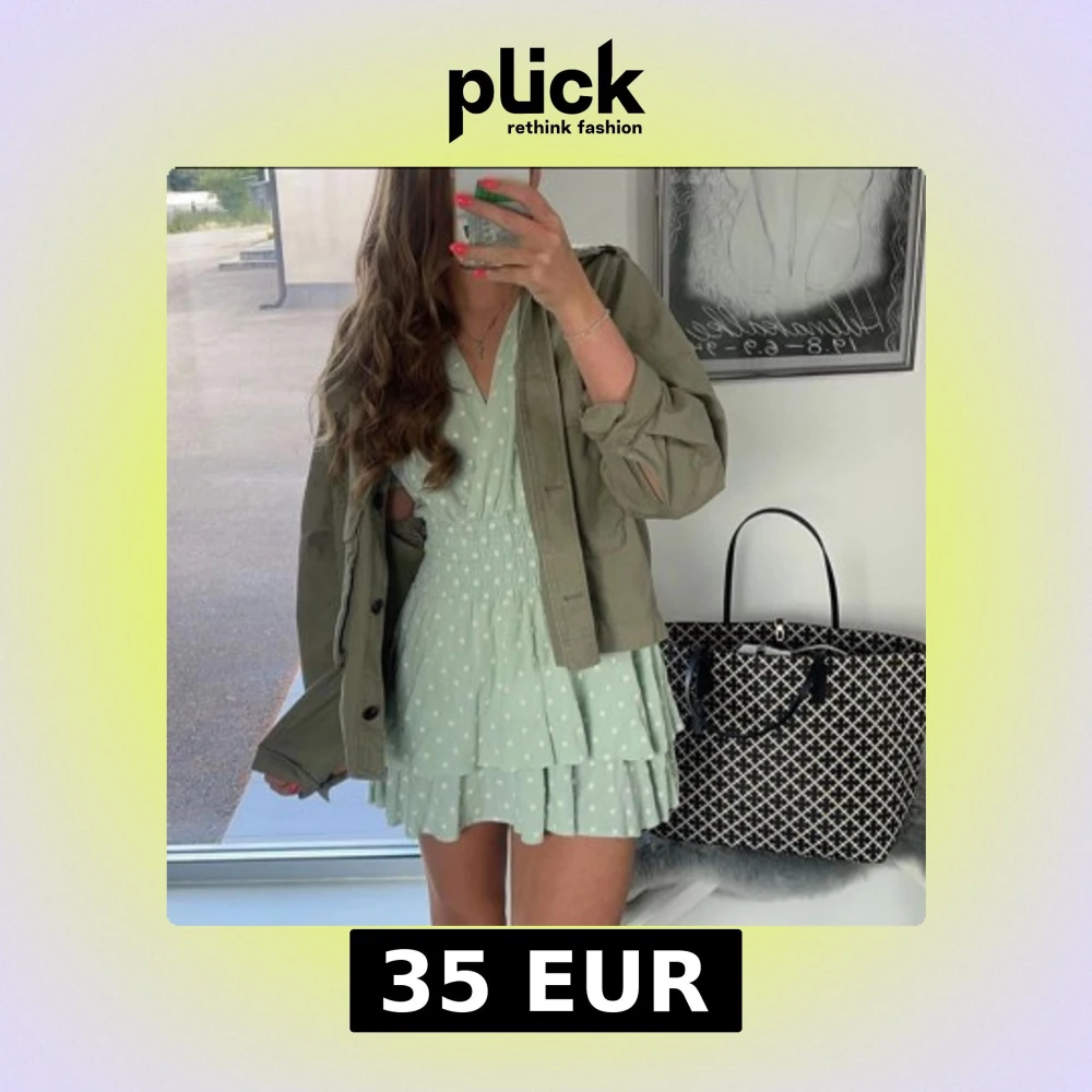 Superfin ljusgrön kortklänning med vita prickar och omlottmodell. Klänningen har volangdetaljer nertill och v-ringning. Perfekt för sommarens alla tillfällen!