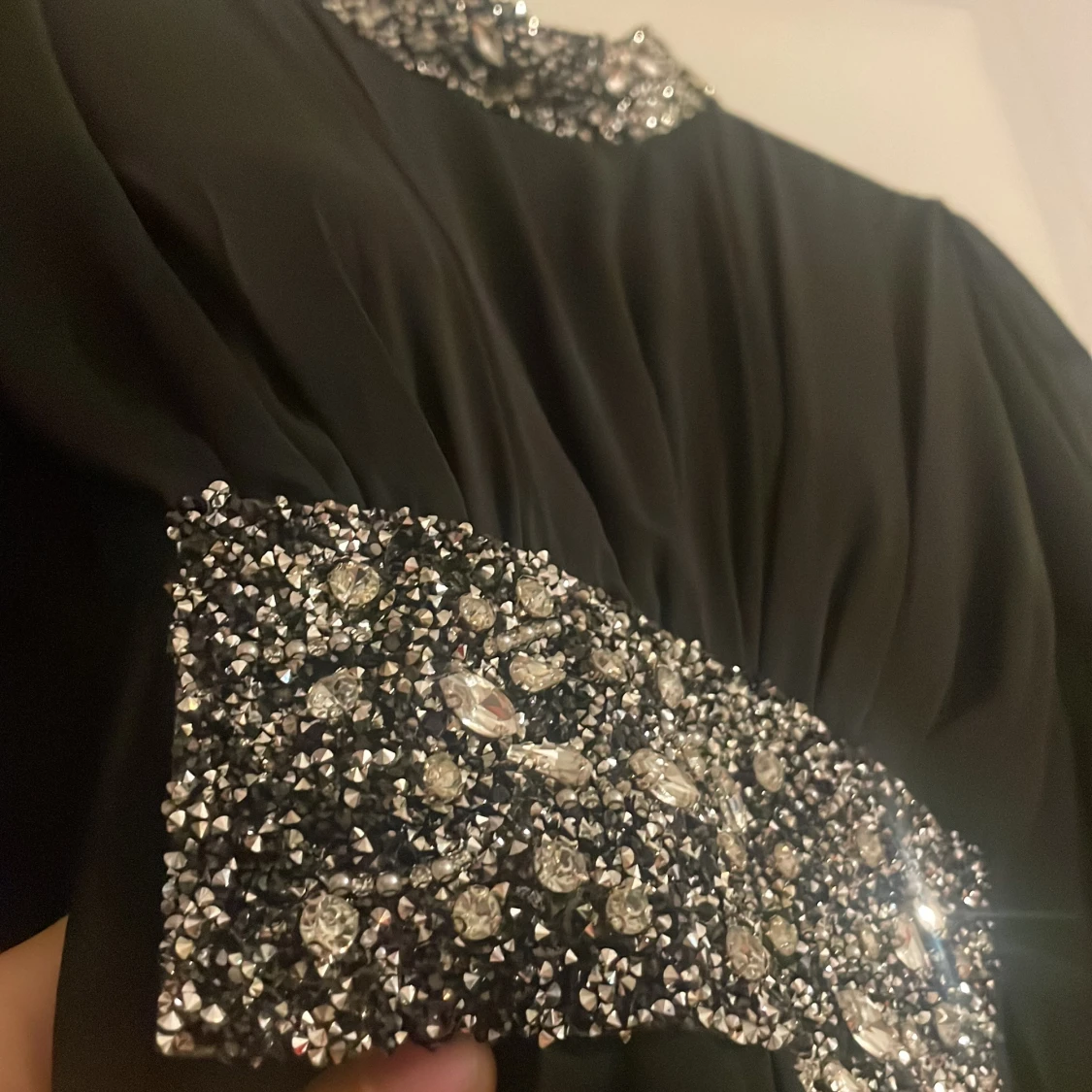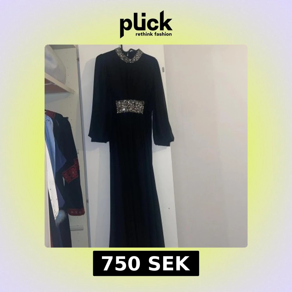Elegant svart långklänning med långa ärmar och glittrande paljettdetaljer vid halsringning och midja. Klänningen har en hög hals och ett flytande fall, perfekt för dig som vill sticka ut med stilrena detaljer och lyxig känsla. Passar för XS/S