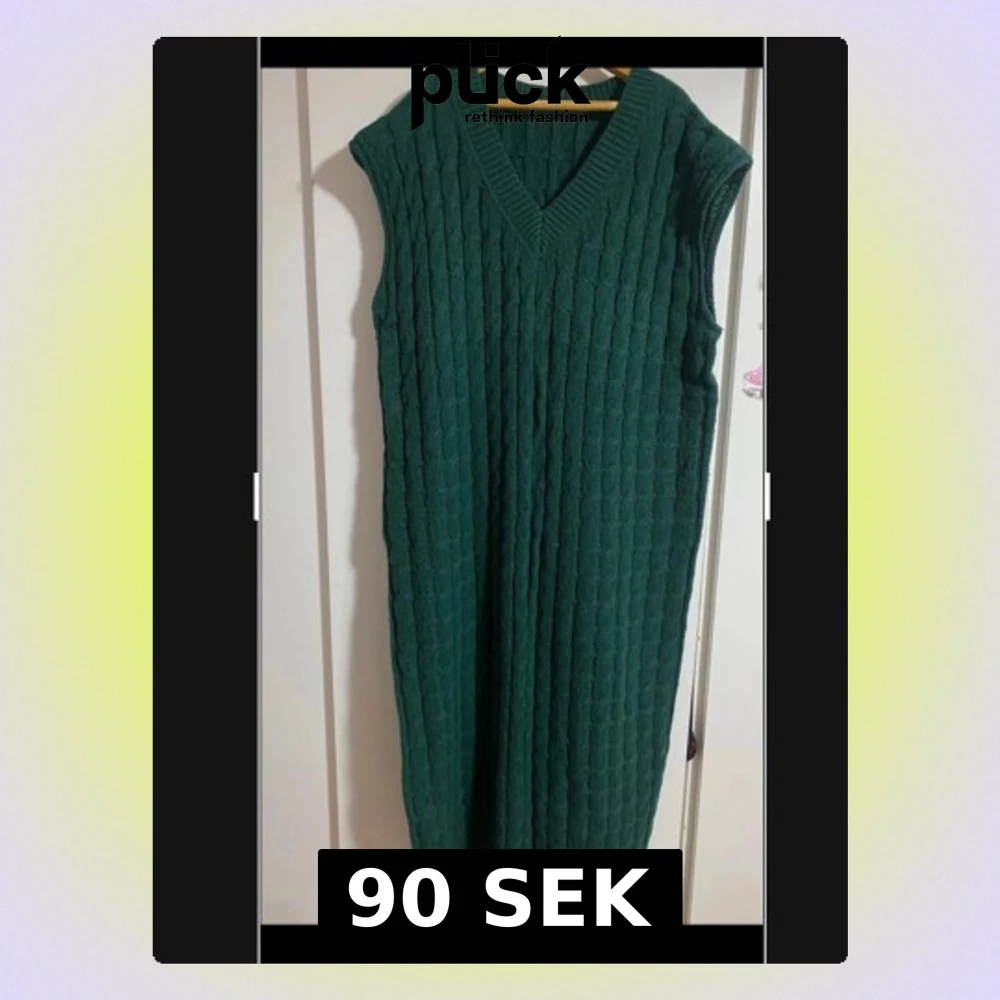 Mysig grön stickad långklänning med v-ringad hals och ärmlös design. Klänningen har ett snyggt kabelstickat mönster och ribbade kanter upptill och nertill. Perfekt för lager-på-lager och chill dagar.