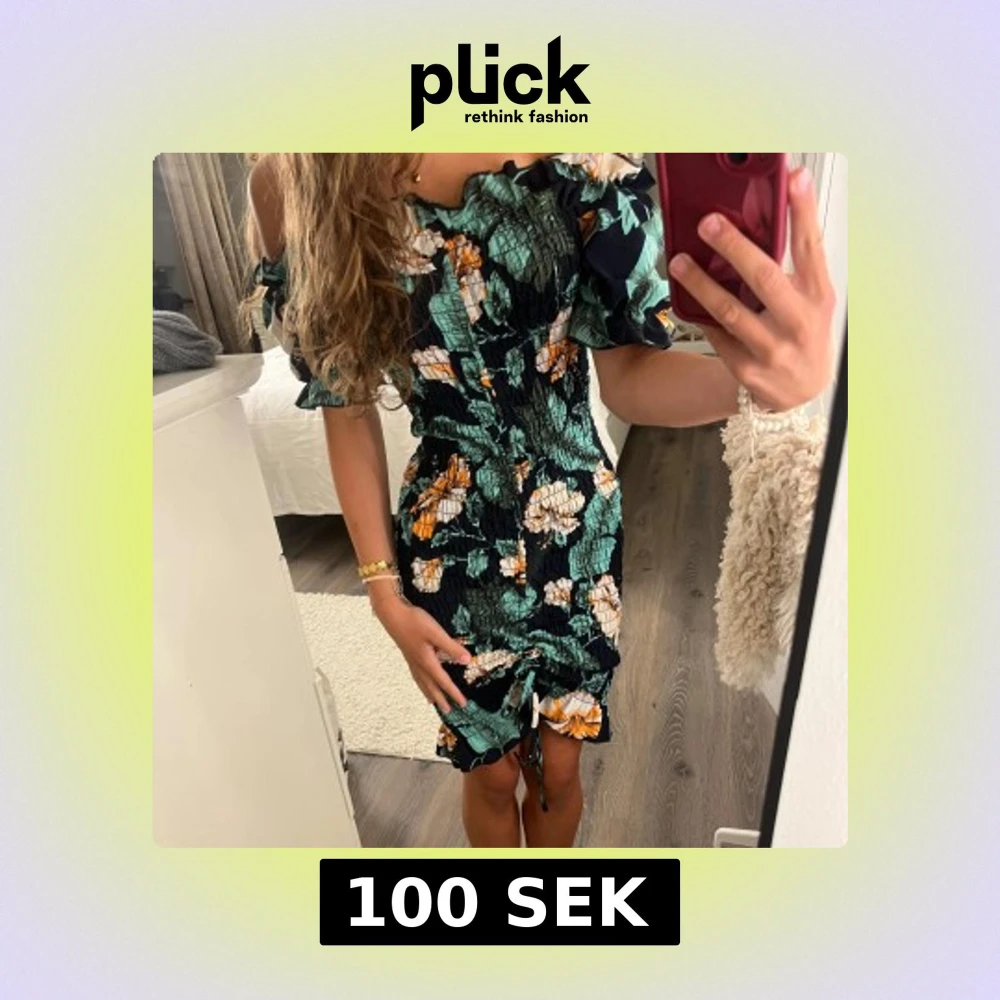 Supersöt kort offshoulder klänning från SHEIN med blommigt mönster i grönt, vitt, orange och marinblått. Klänningen är i mycket bra skick💗finns snören att justera längden på nere på klänningen:)