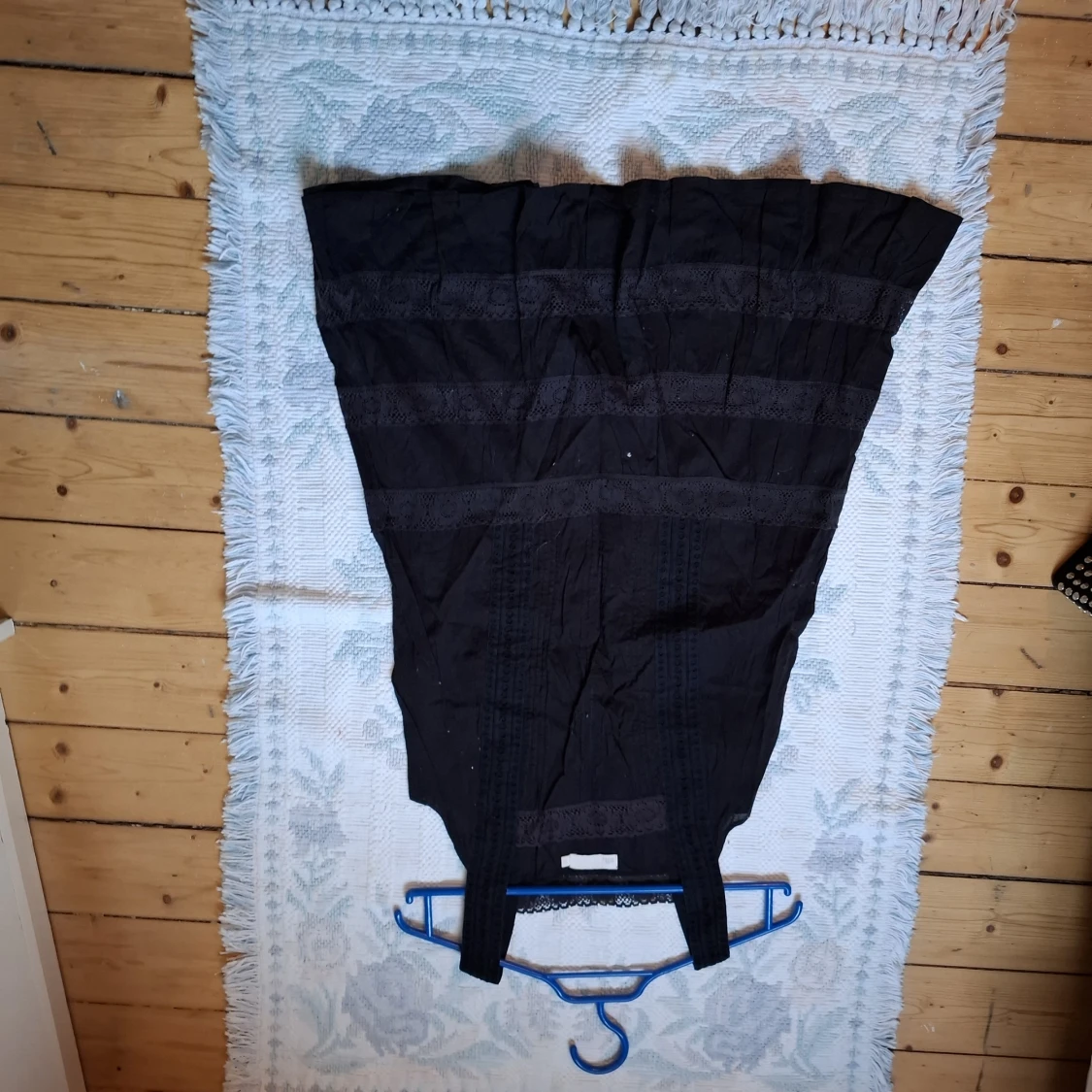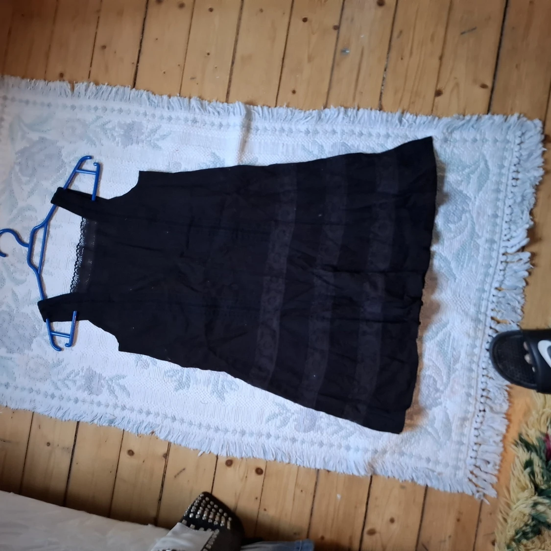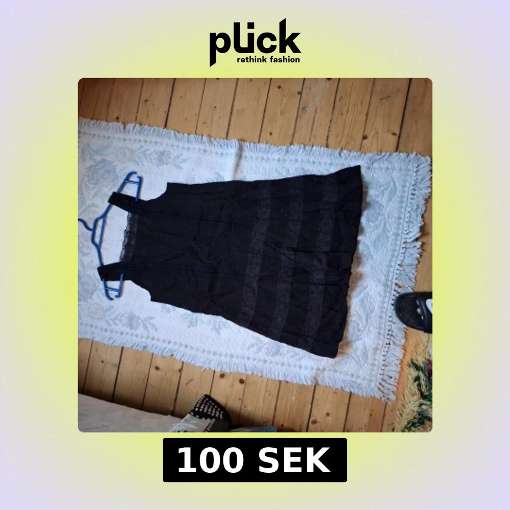 Svart ärmlös klänning med breda axelband och fina spetsdetaljer längs kjolen. Klänningen har en lätt utställd form och är perfekt för varma dagar. Enkel och stilren design som passar till många tillfällen.