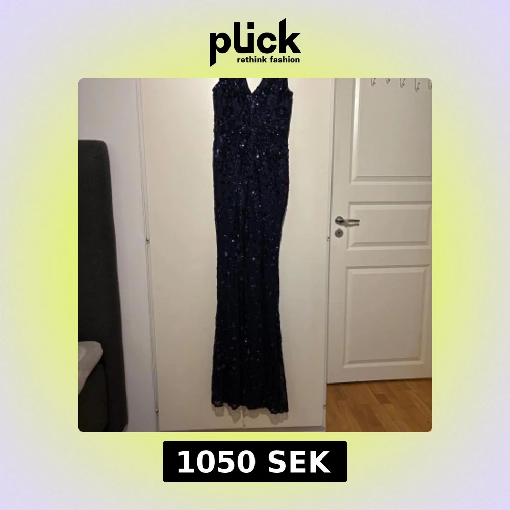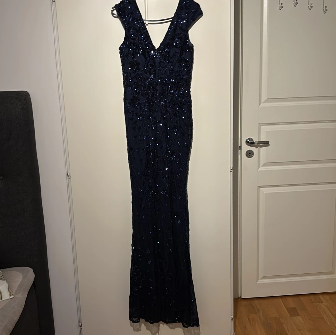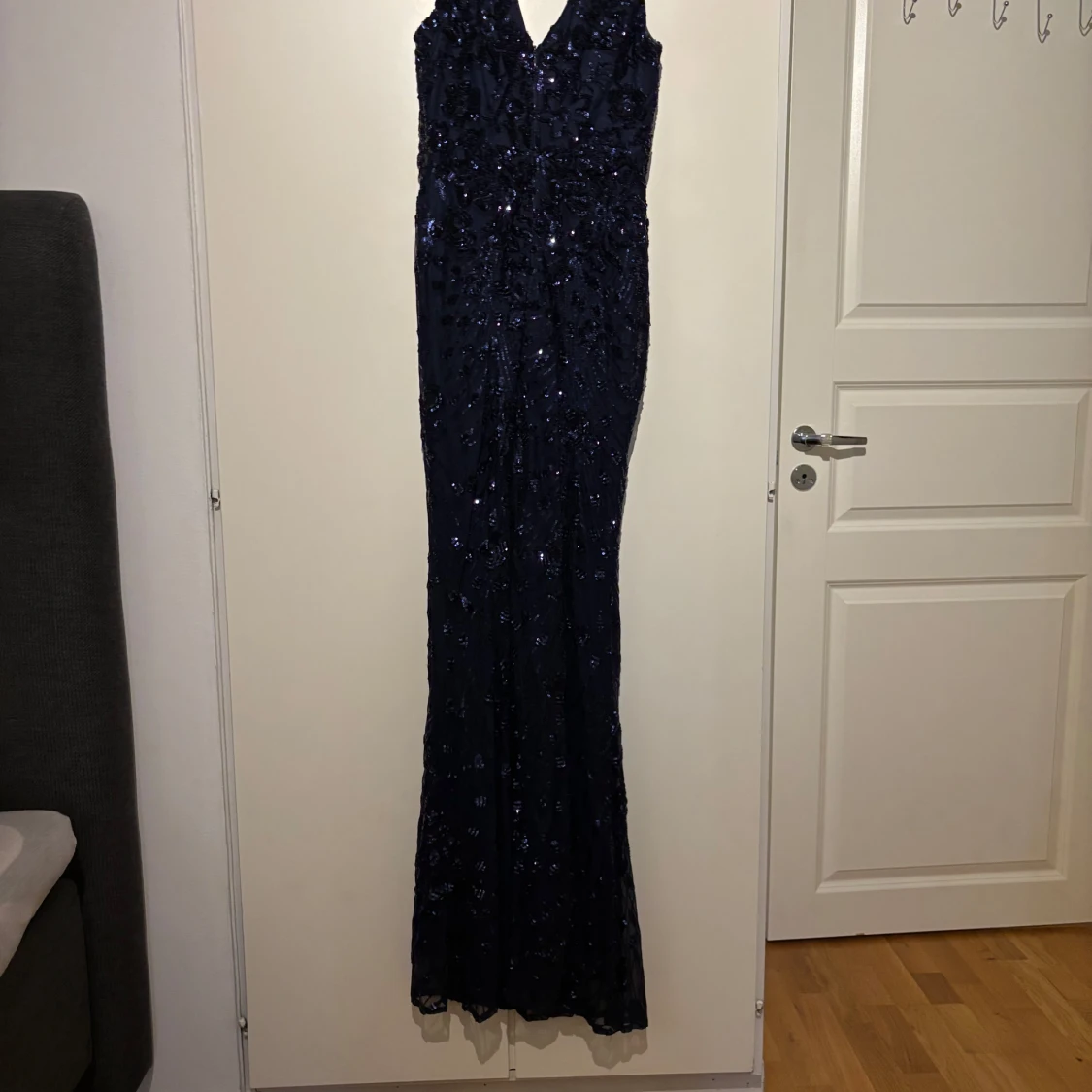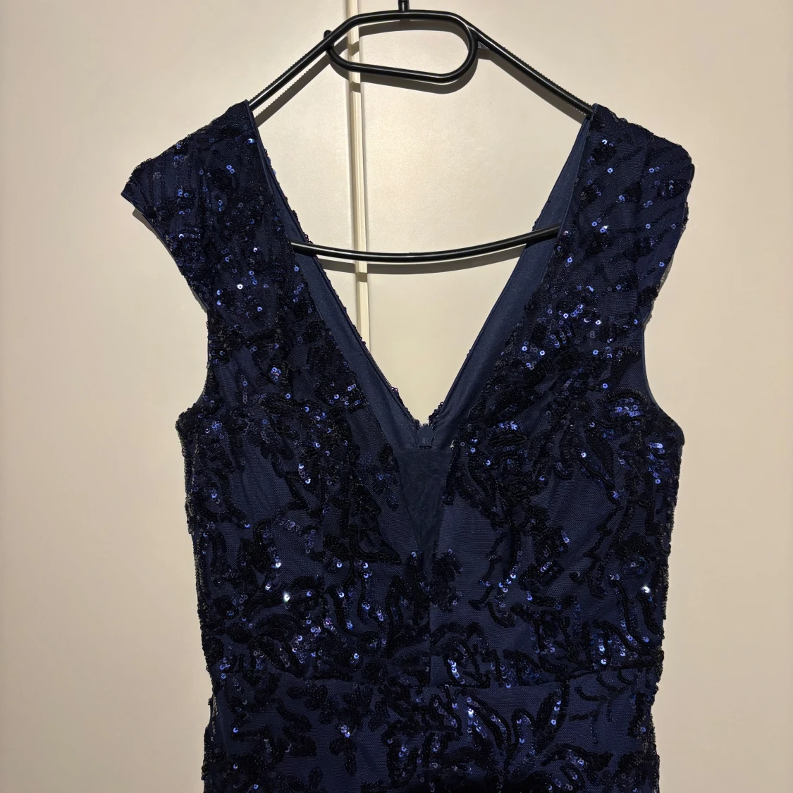 Säljer en marinblå långklänning med v-ringning och ärmlös design. Klänningen är täckt av glittriga paljetter som ger en lyxig känsla. Den har en figurnära passform och är perfekt för bal eller fest. Materialet är troligtvis polyester med paljettbroderi.