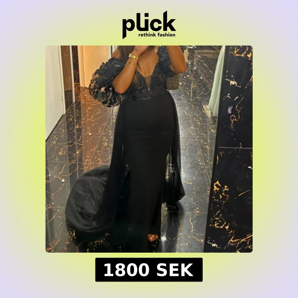 Superelegant svart långklänning med offshoulder och stora puffärmar dekorerade med 3D-blommor. Klänningen har figurnära passform, djup v-ringning och lång släp baktill. Perfekt för bal eller fest där du vill sticka ut. Endast använd 1 gång