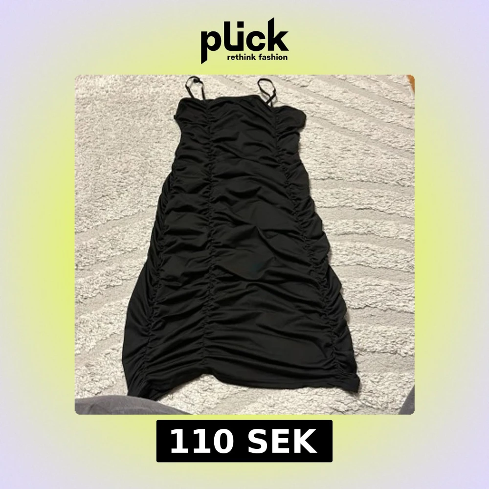 Snygg svart kortklänning med smala axelband och ruched detaljer längs hela klänningen. Figurnära passform som framhäver siluetten och ger en trendig look. Perfekt för dig som vill sticka ut med en stilren och modern vibe.