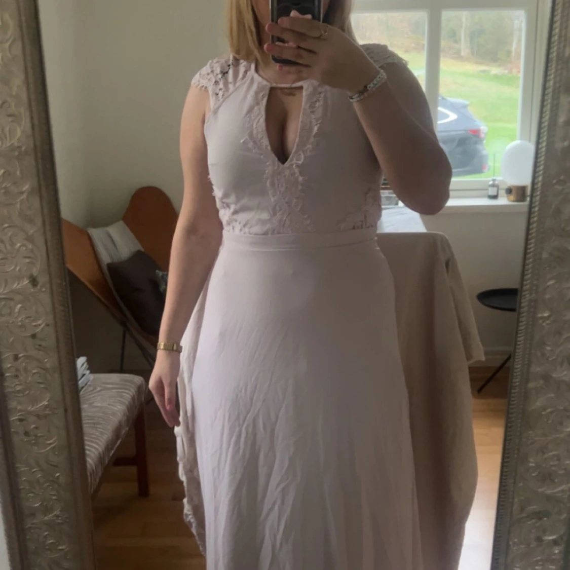Ljusrosa långklänning med v-ringning och spets upptill. Klänningen har öppen rygg med spetsdetaljer och en elegant, figurnära passform upptill som övergår i en vidare kjol. Perfekt för speciella tillfällen. Aldrig använt köpt för 1000 säljer för 950(850) vi snabba affärer. Skriv om ni vill ha flera bilder. ❤️